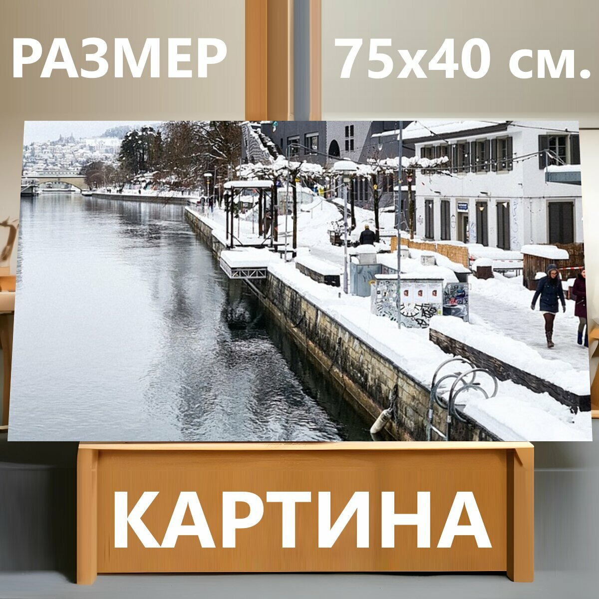 10 цен на Картина на холсте "Снег, река, здания" на подрамнике 75х40 см. для интерьера