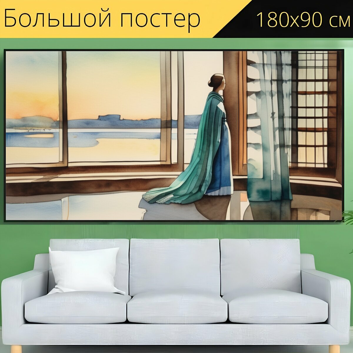 Большой постер "Женщина с шалью, в стиле акварель" 180 x 90 см. для интерьера на стену информация: