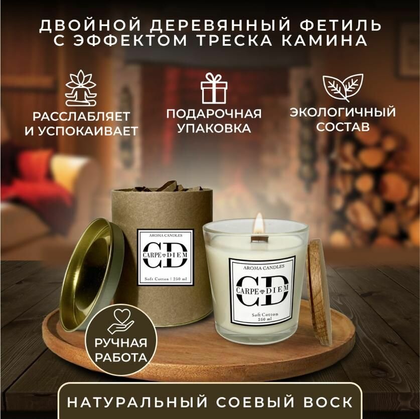 Ароматическая свеча в стекле с крышкой для дома с ароматом " Нежный Хлопок " CARPE DIEM, аромасвеча с деревянным фитилем 250 мл информация: