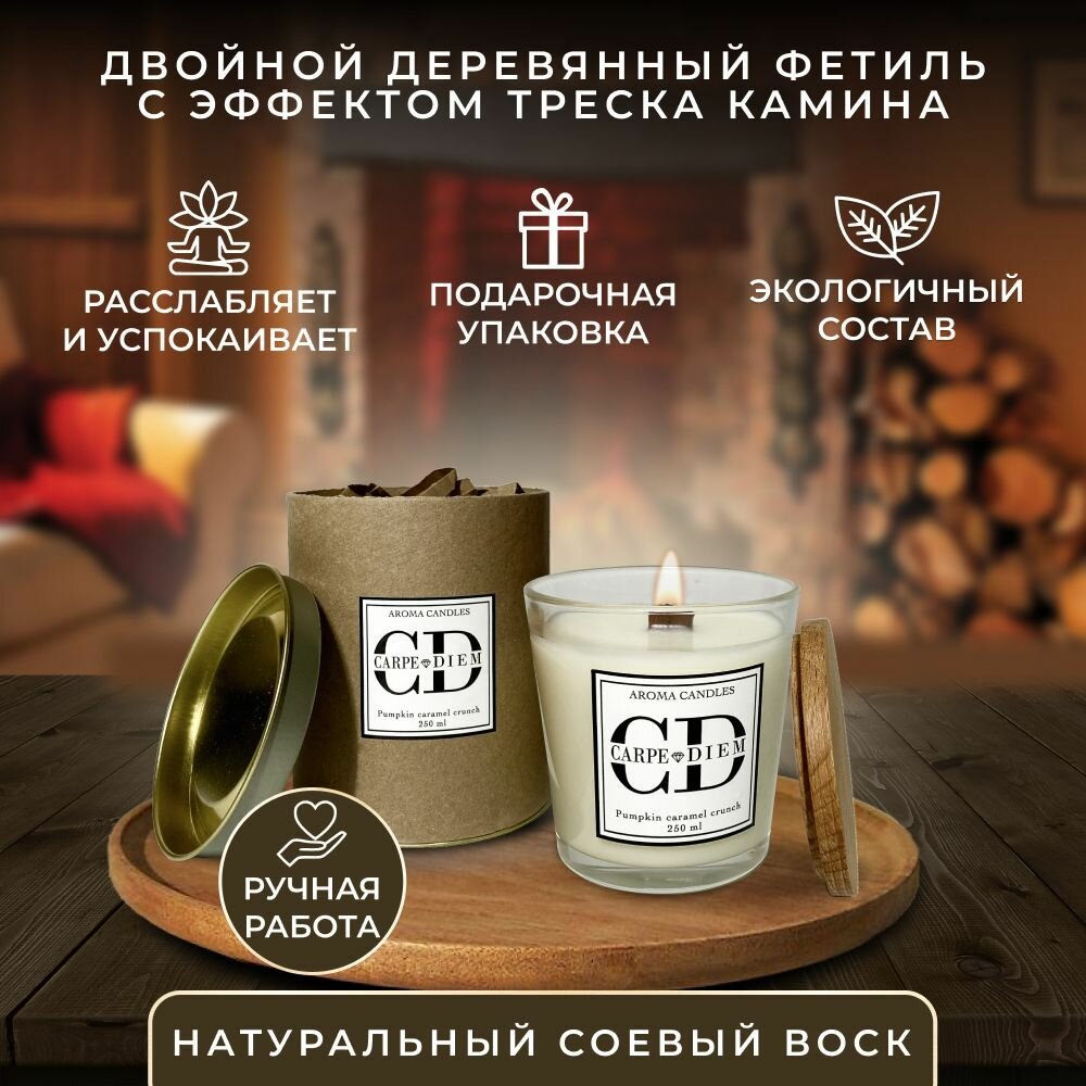 Ароматическая свеча в стекле с крышкой для дома с ароматом " Тыквенно - Карамельный хруст " CARPE DIEM, аромасвеча с деревянным фитилем 250 мл информация: