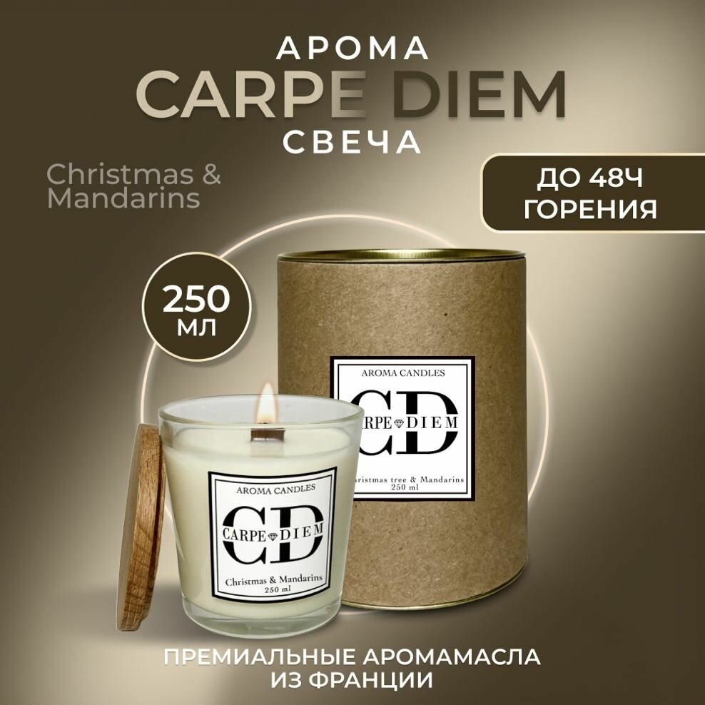 Ароматическая свеча в стекле с крышкой для дома с ароматом " Рождественская Ель и Мандарины " CARPE DIEM, аромасвеча с деревянным фитилем 250 мл информация: