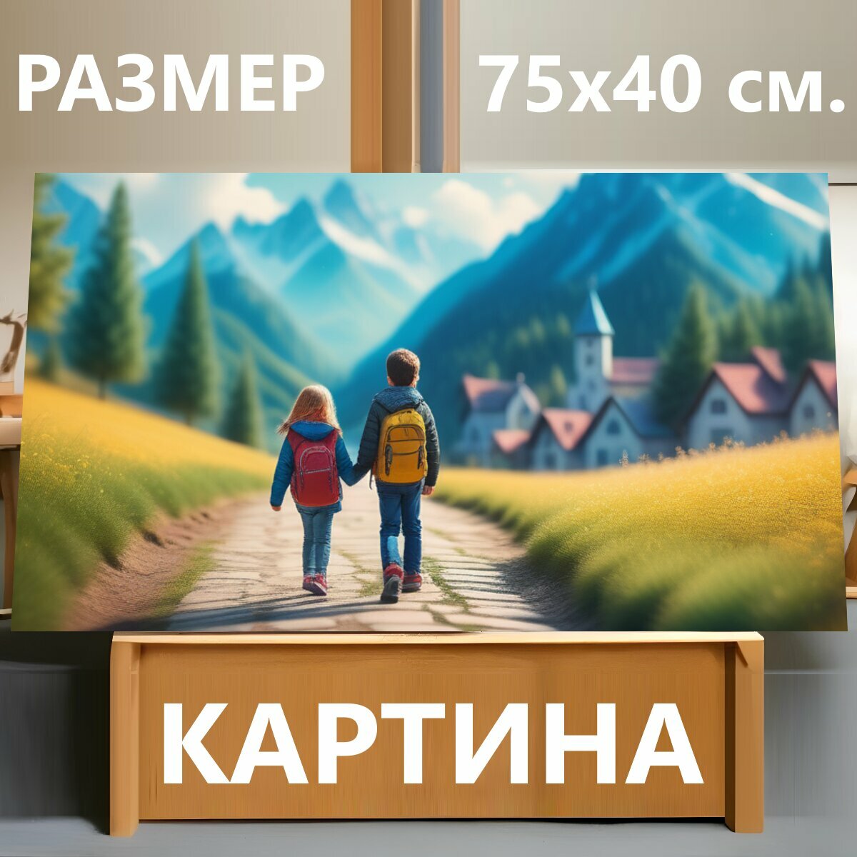 10 цен на Картина на холсте "Пейзаж с детьми карандашом красивый, " на подрамнике 75х40 см. для интерьера