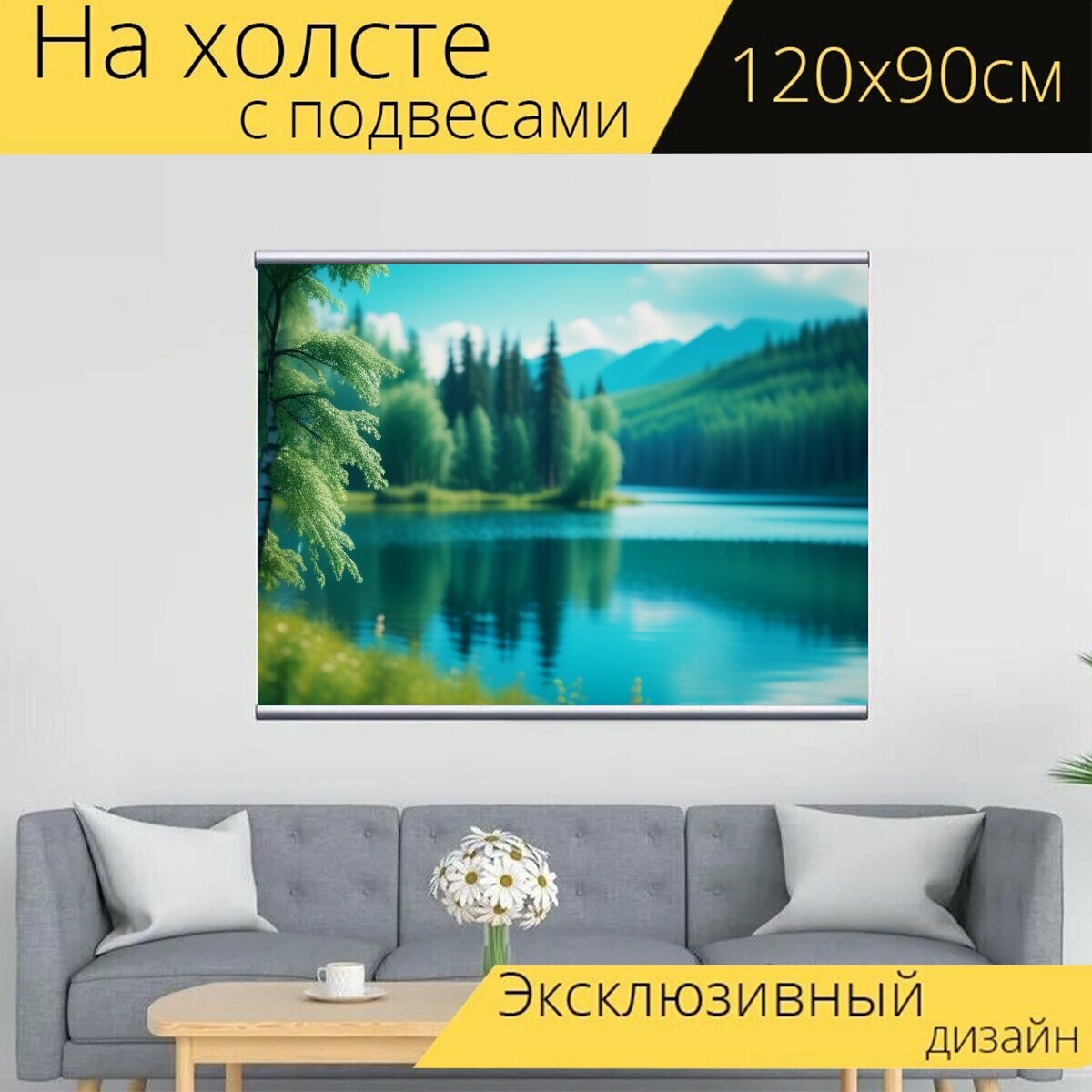 10 цен на Картина на холсте "Русский пейзаж с озером крутой, " с подвесами 120х90 см. для интерьера на стену