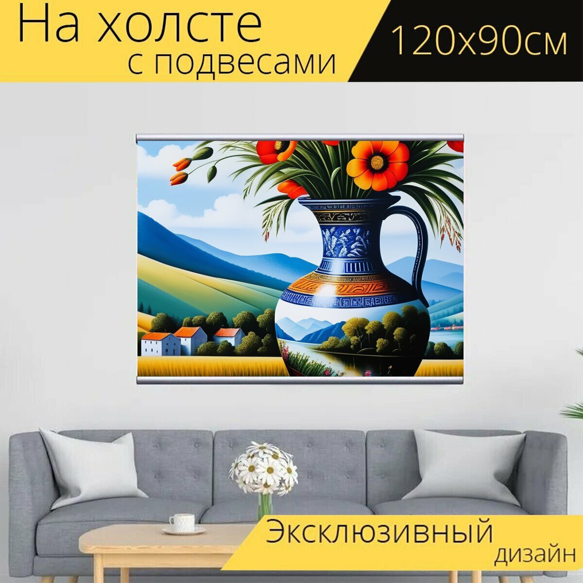 10 цен на Картина на холсте "Пейзаж с вазой живопись максимал, " с подвесами 120х90 см. для интерьера на стену