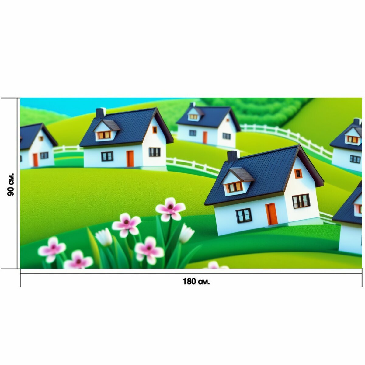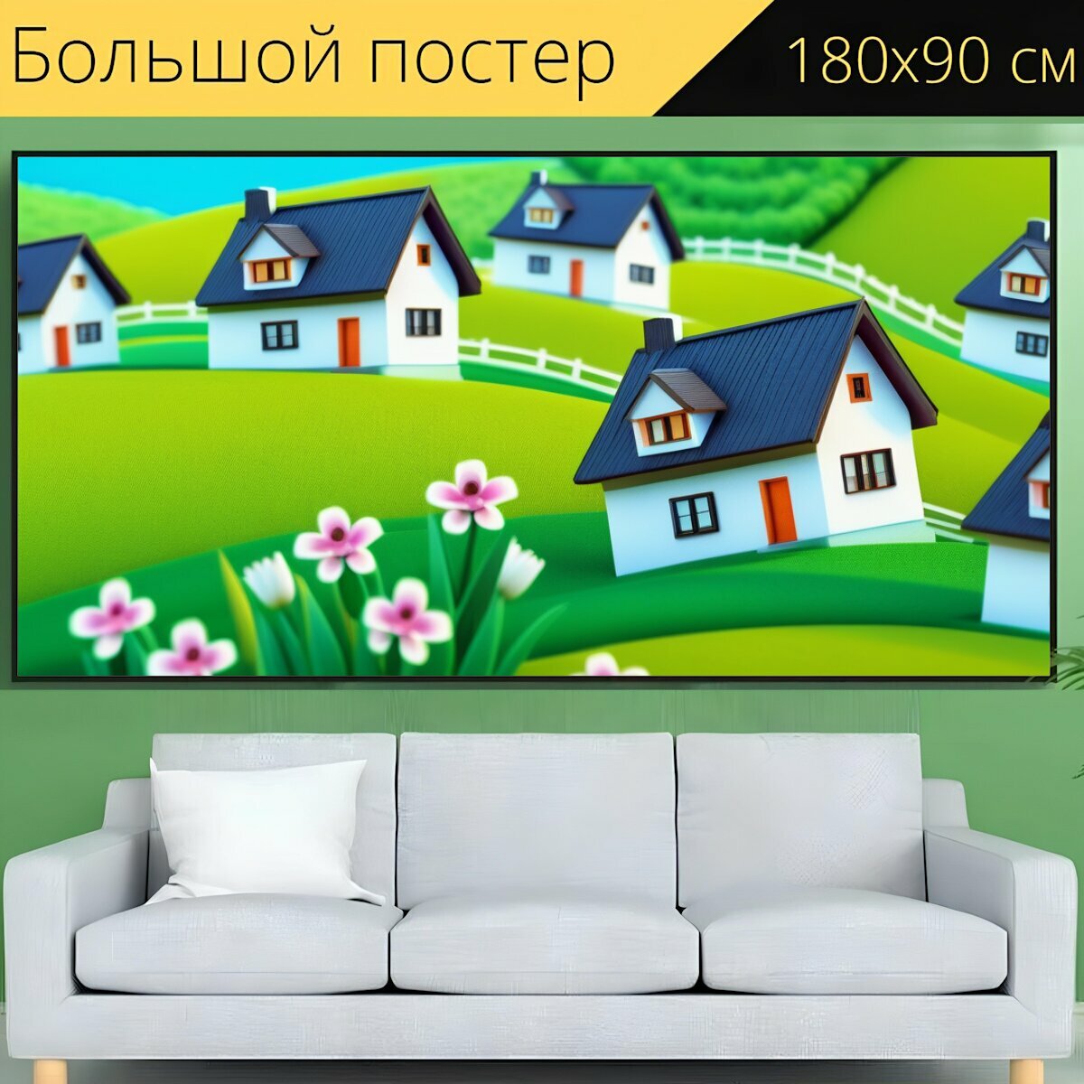 Большой постер "Весенний пейзаж с домиками смешной, " 180 x 90 см. для интерьера на стену информация: