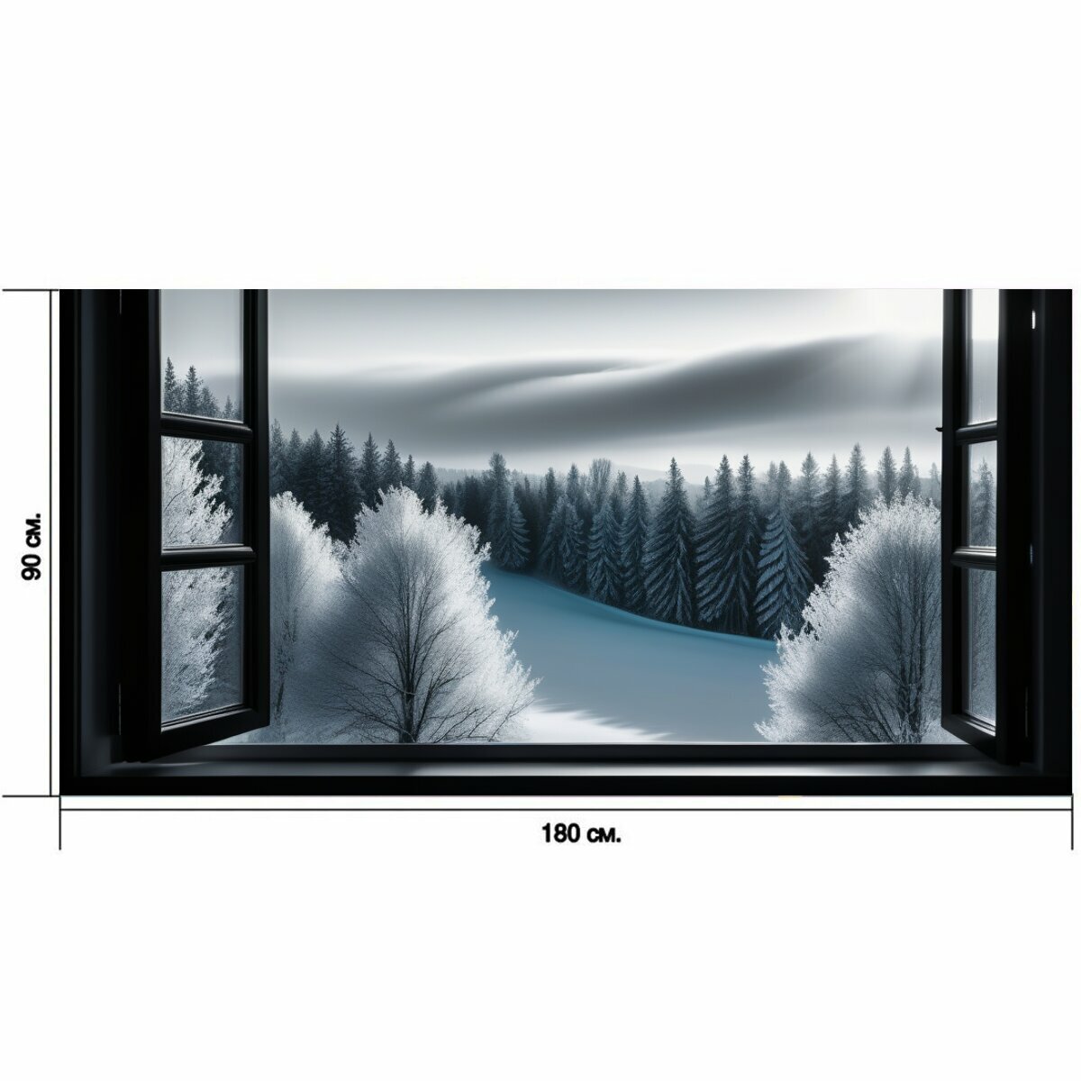 Большой постер "Пейзаж с окна зимний чернобелый, " 180 x 90 см. для интерьера на стену информация: