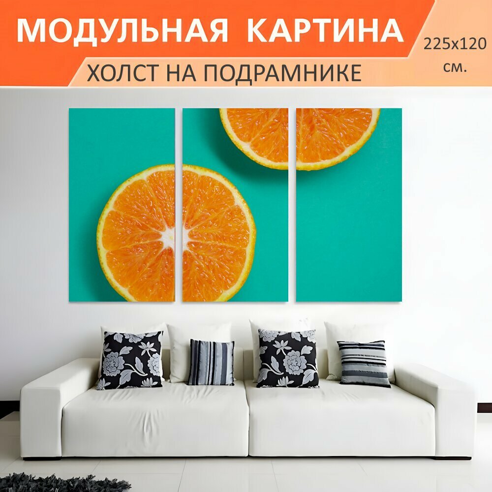 Модульная картина на холсте "Апельсин, фрукты, дизайн" триптих на подрамнике 225х120 см. для интерьера информация: