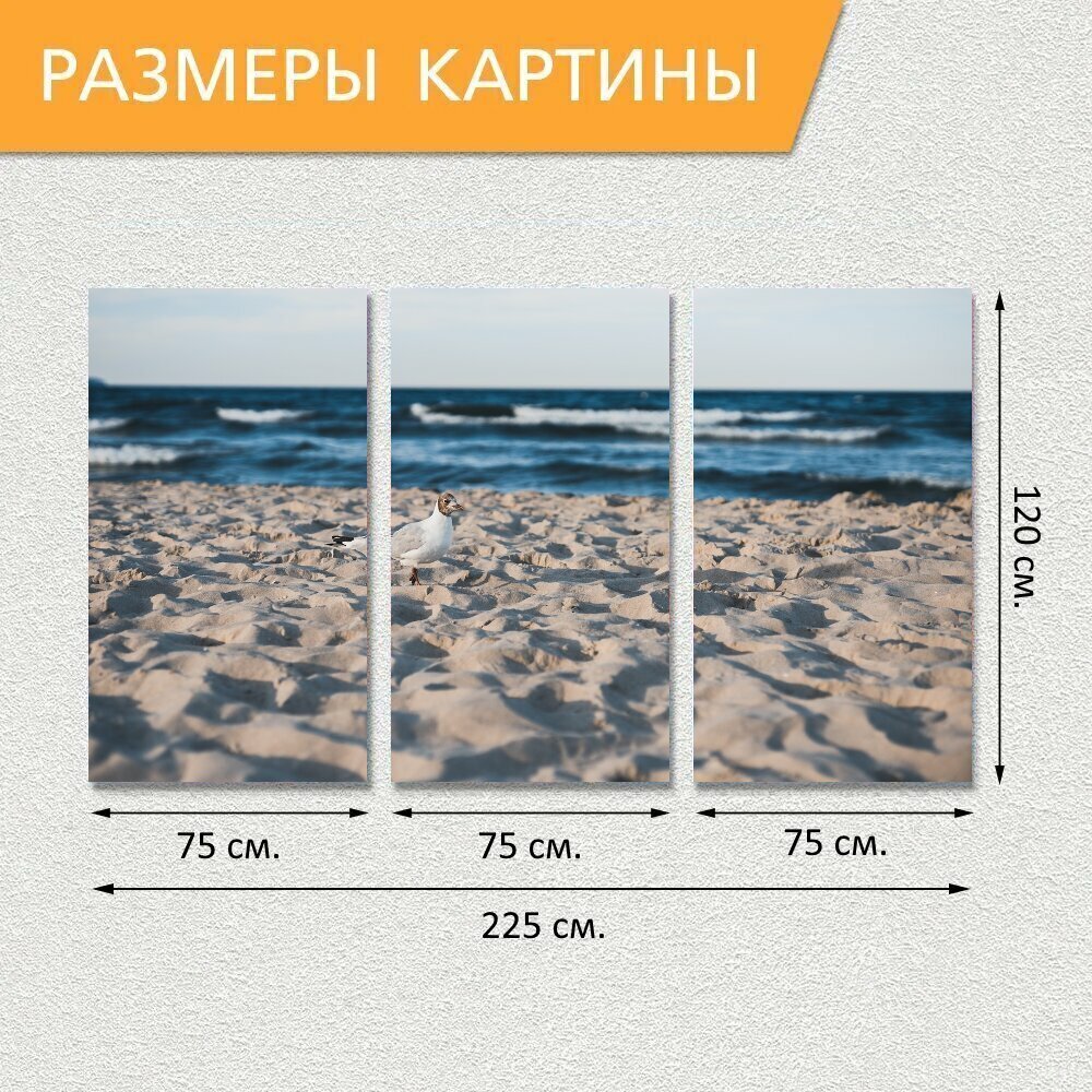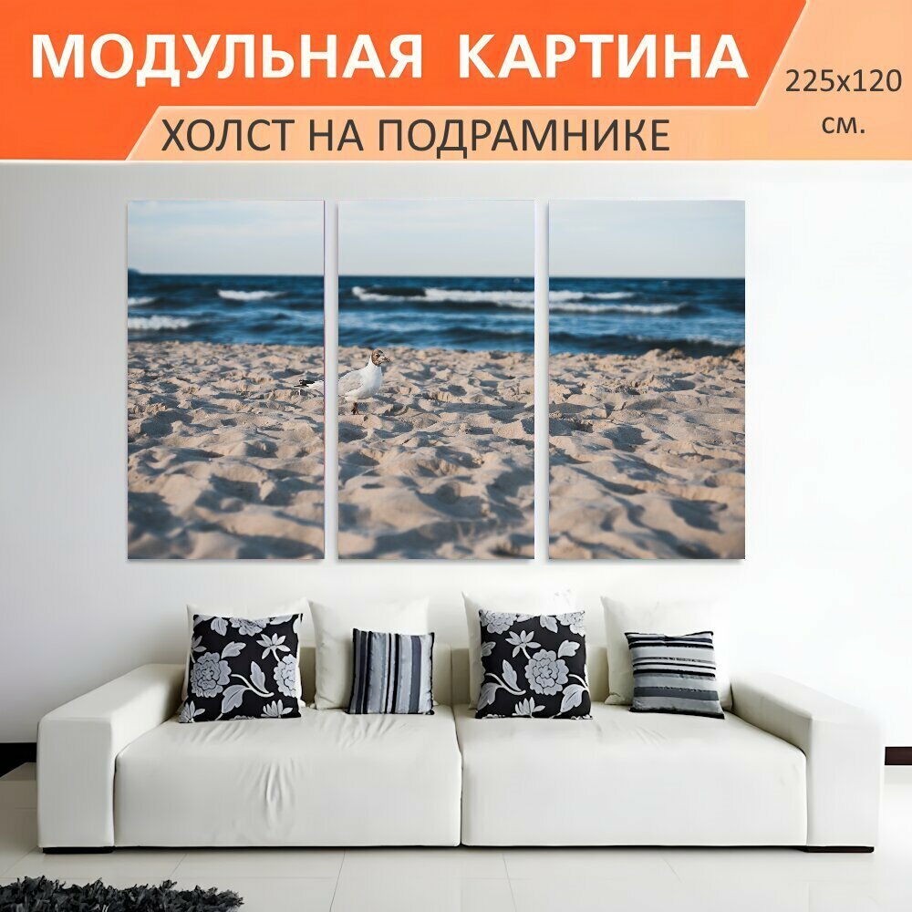 10 цен на Модульная картина на холсте "Озёрная чайка, песок, пляж" триптих на подрамнике 225х120 см. для интерьера