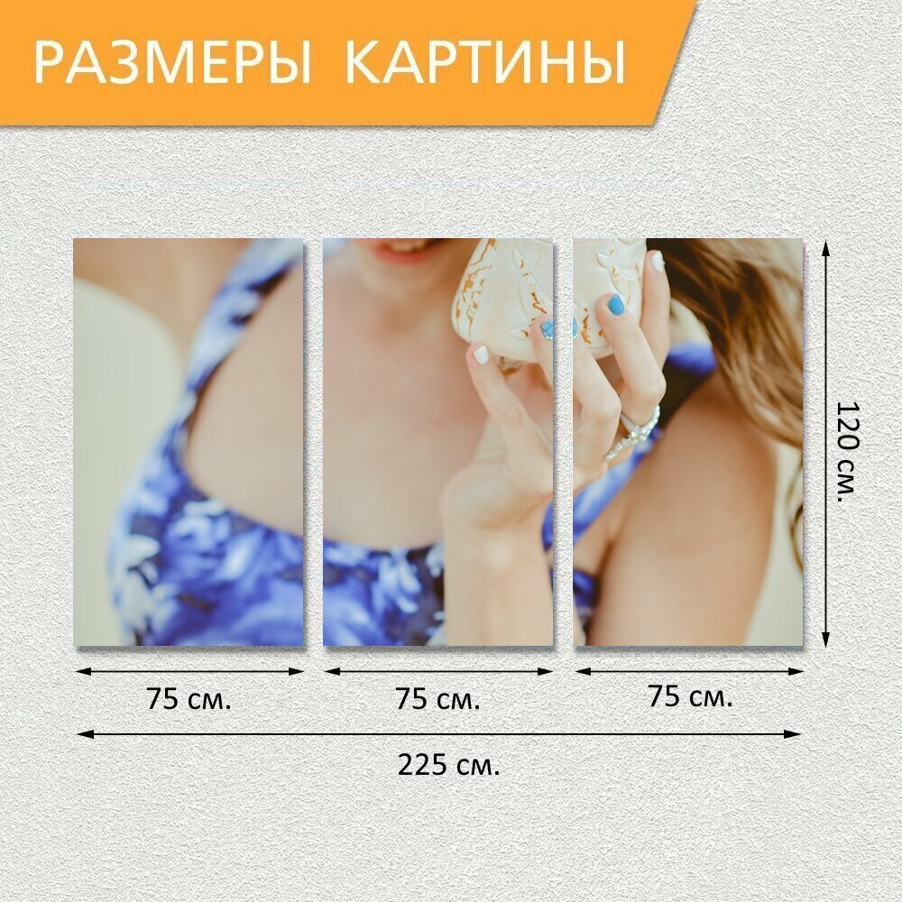 10 цен на Модульная картина на холсте "Море, песок, девушка" триптих на подрамнике 225х120 см. для интерьера