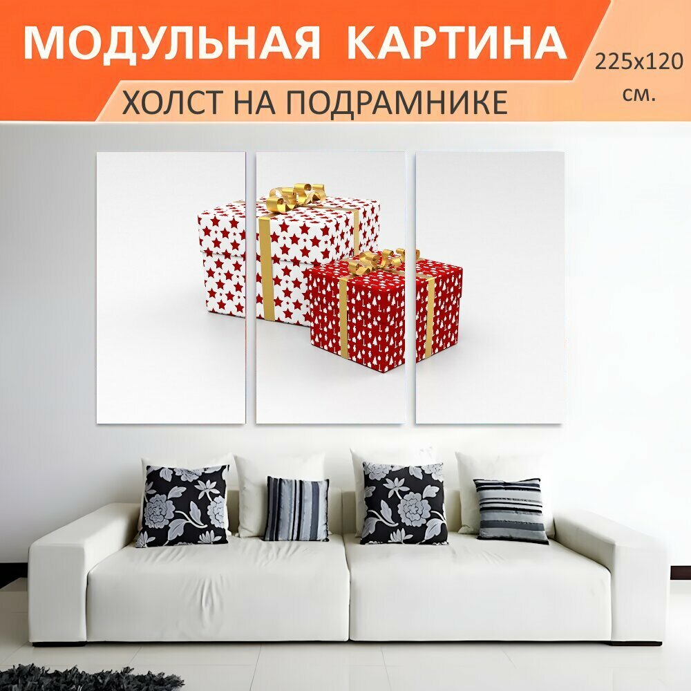 10 цен на Модульная картина на холсте "Подарки, пакеты, коробки" триптих на подрамнике 225х120 см. для интерьера