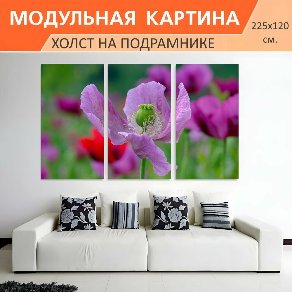10 цен на Модульная картина на холсте "Мак, фиолетовый, цветок мака" триптих на подрамнике 225х120 см. для интерьера