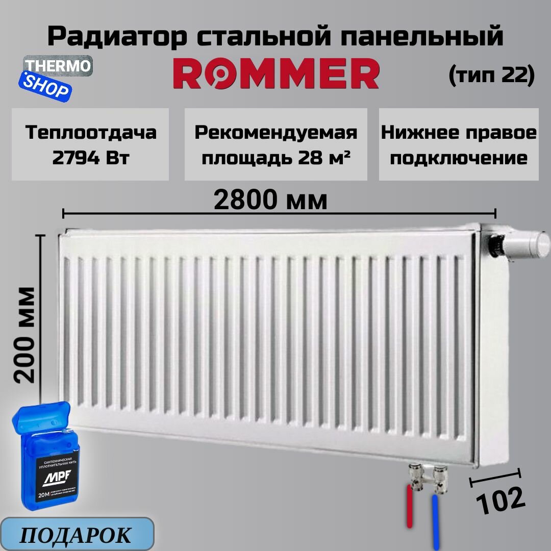 Отзывы на Радиатор стальной панельный 200х2800 нижнее подключение Ventil 22/200/2800 Сантехническая нить 20 м
