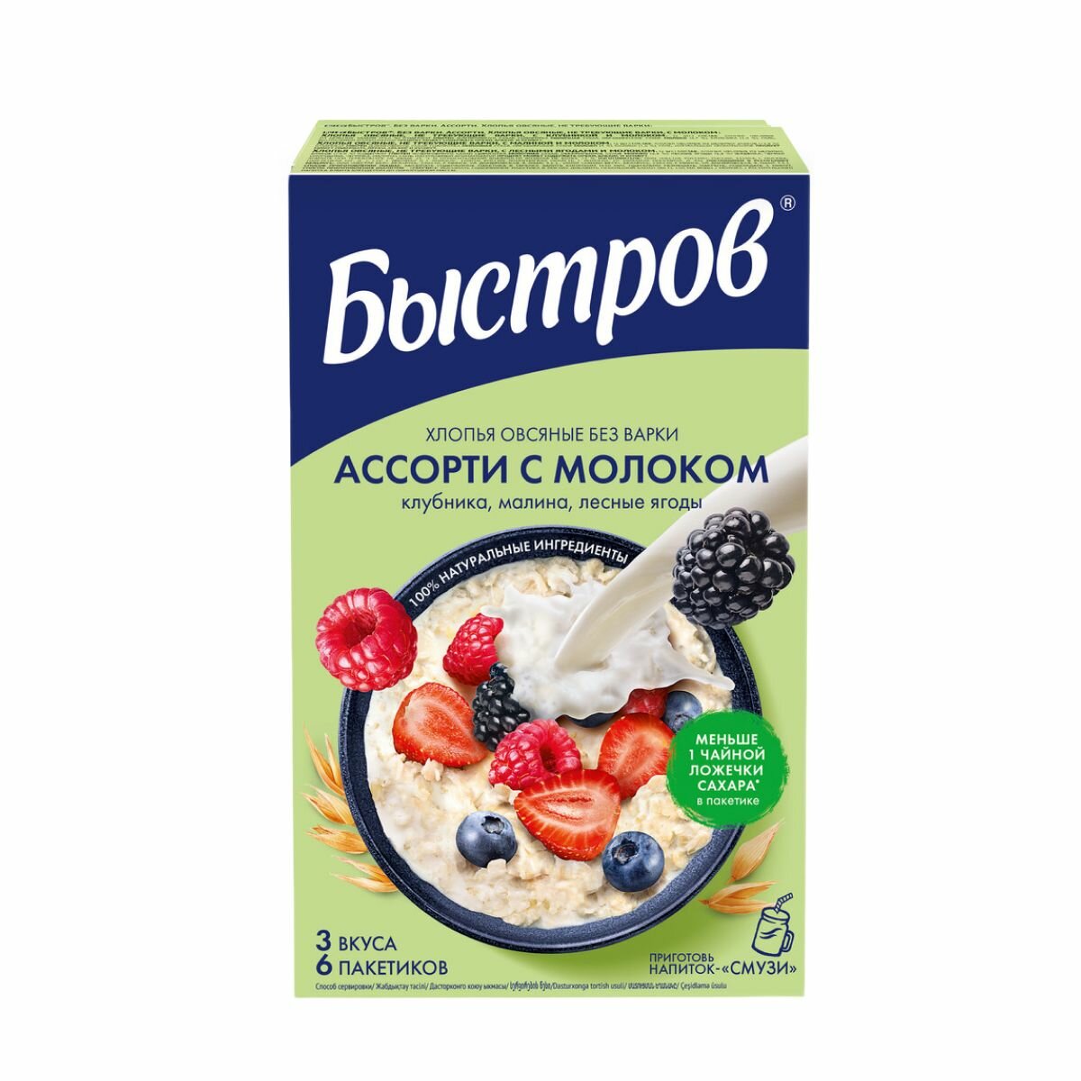 Каша Быстров овсяные Ассорти с молоком клубника/малина/лесные ягоды, 240г, 6 пакетиков х 40г