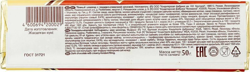 Шоколад тёмный с помадной сливочной начинкой 50г /КФ Крупской информация: