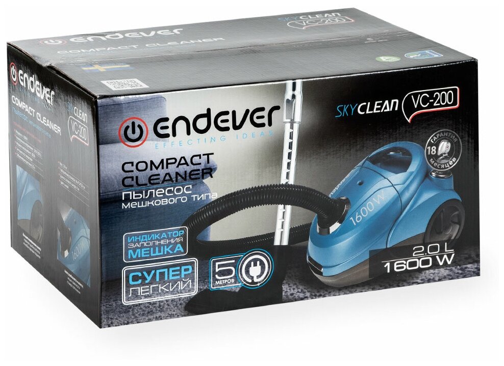 Пылесос Endever SkyClean VC-200 (1 600Вт, мешок для пыли, 2л., синий) информация: