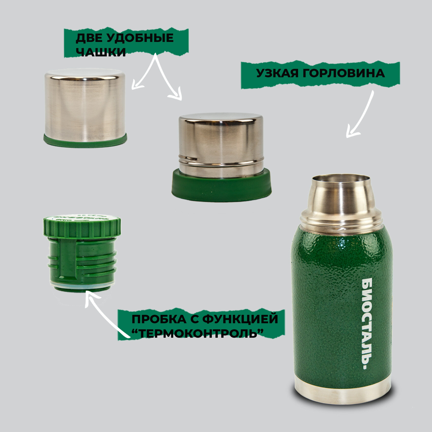 Термос Biostal NBA-1000G /1л,охота с узкой горл., 2 чашки, зеленый