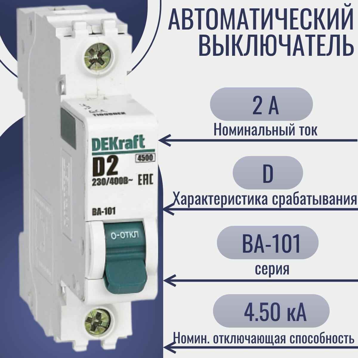 Выключатель автоматический однополюсный 2А D ВА-101 4.5кА 11098DEK DEKraft информация: