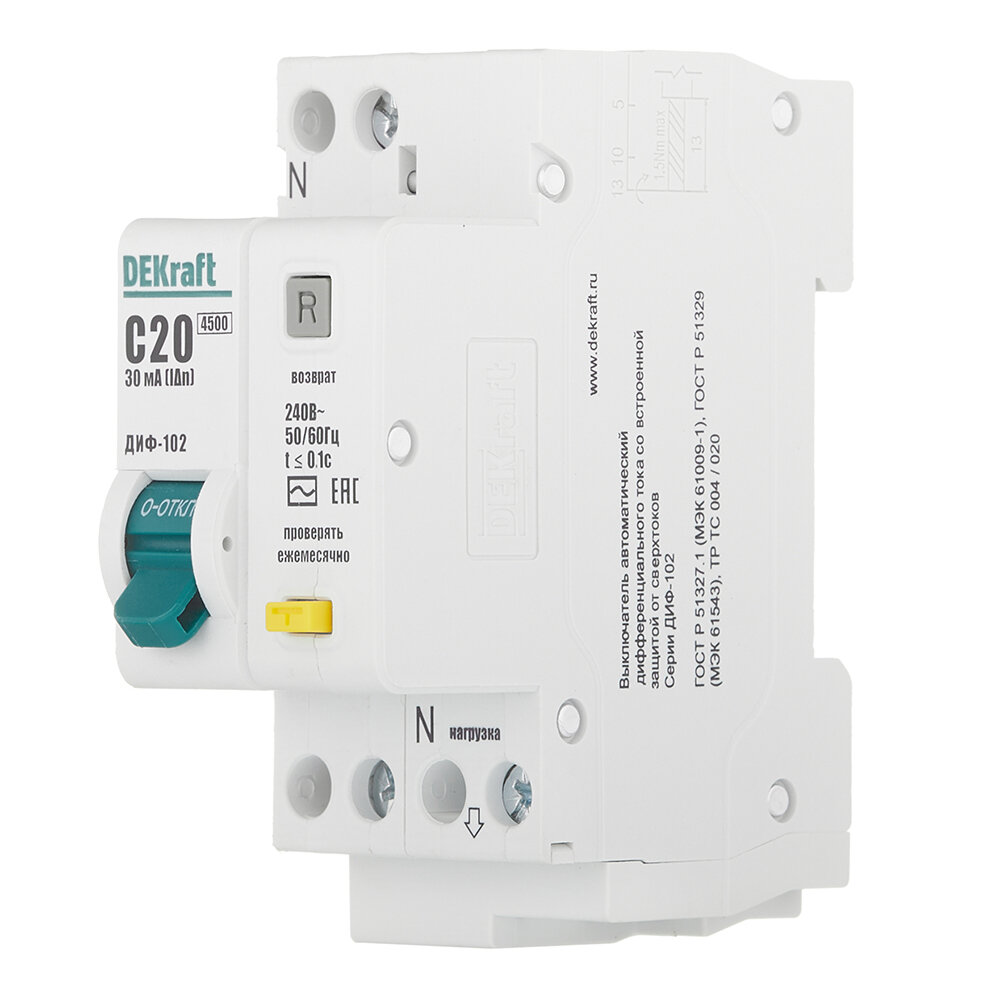 Дифференциальный автоматический выключатель DEKraft ДИФ-103 1P+N 20А 30мА 4.5кА класс AC