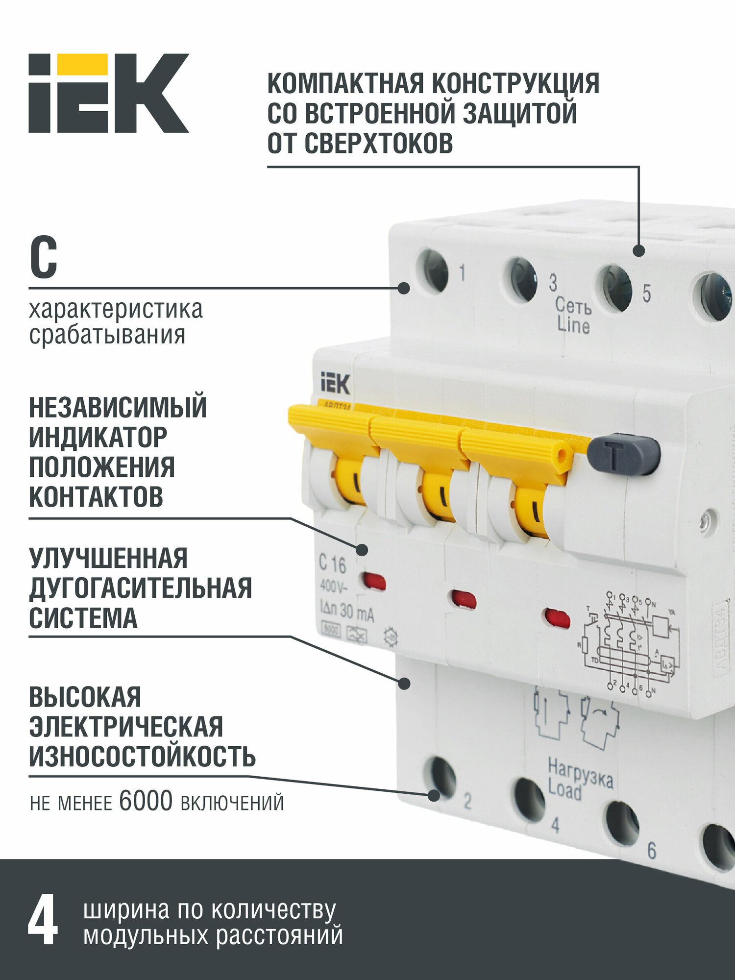Дифференциальный автомат IEK АВДТ 34 4П 30 мА C 6 кА A электромеханический 16 А
