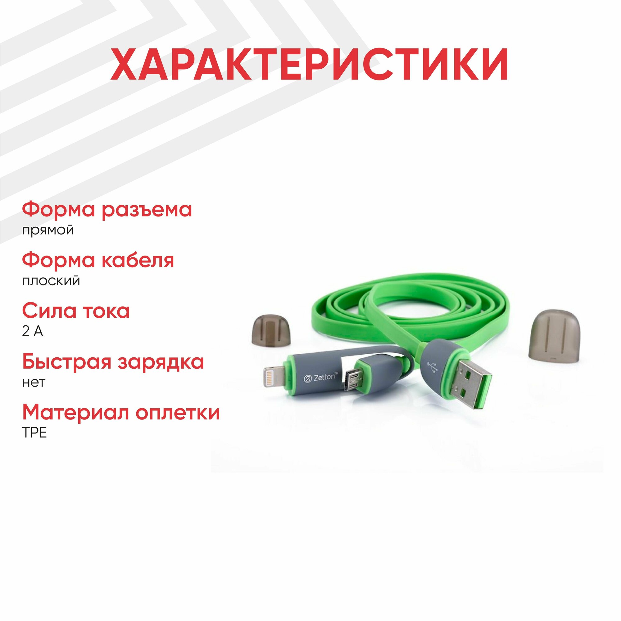 Отзывы на USB кабель передачи данных Zetton 2в1 разъем для Apple Lightning 8 pin/Micro USB зеленый (ZTLSUSB2IN