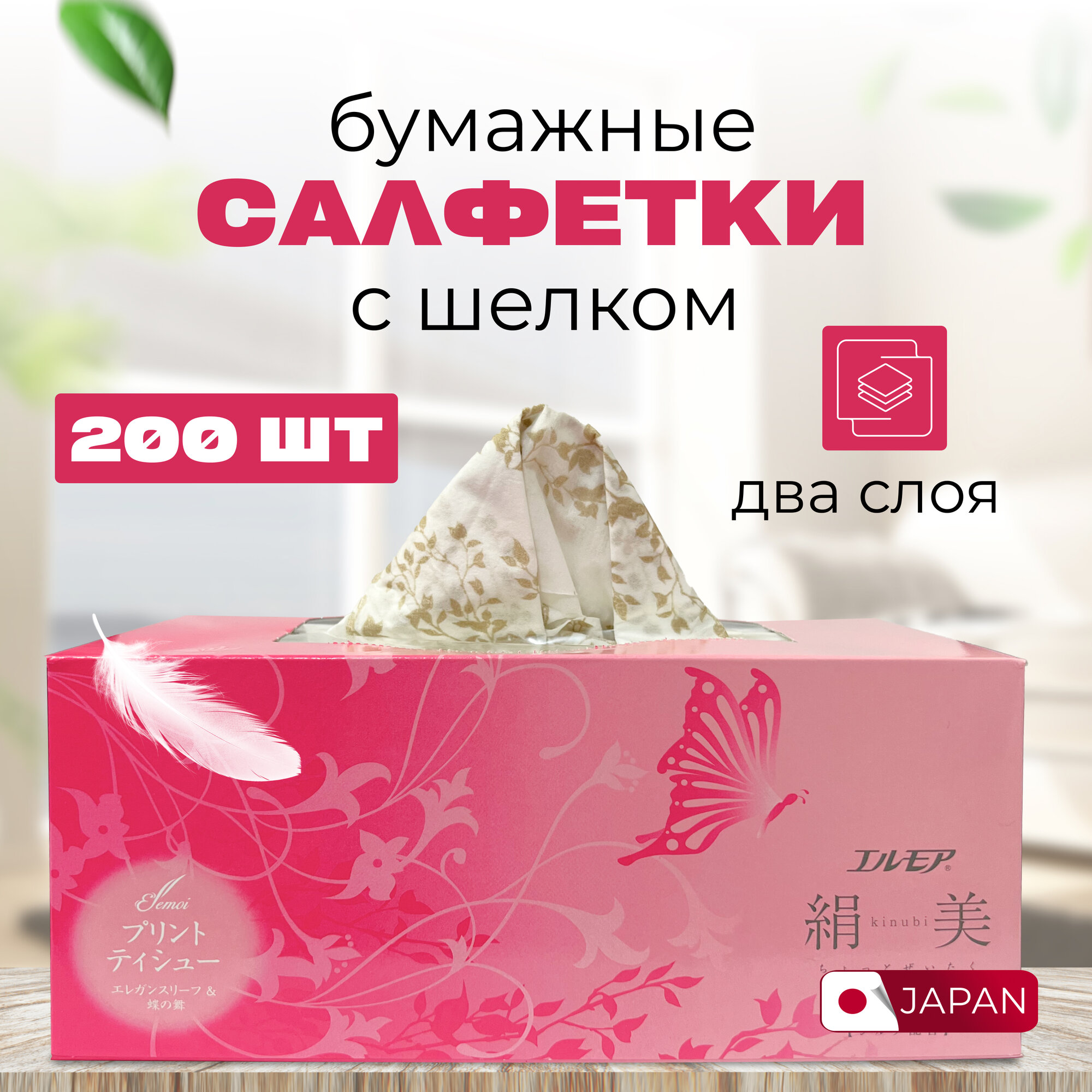 Салфетки бумажные с шелком, двухслойные Kami Shodji ELLEMOI "Kinu-bi", 200 шт, Япония / Салфетки косметические в коробке, японское премиум качество, сухие для всей семьи