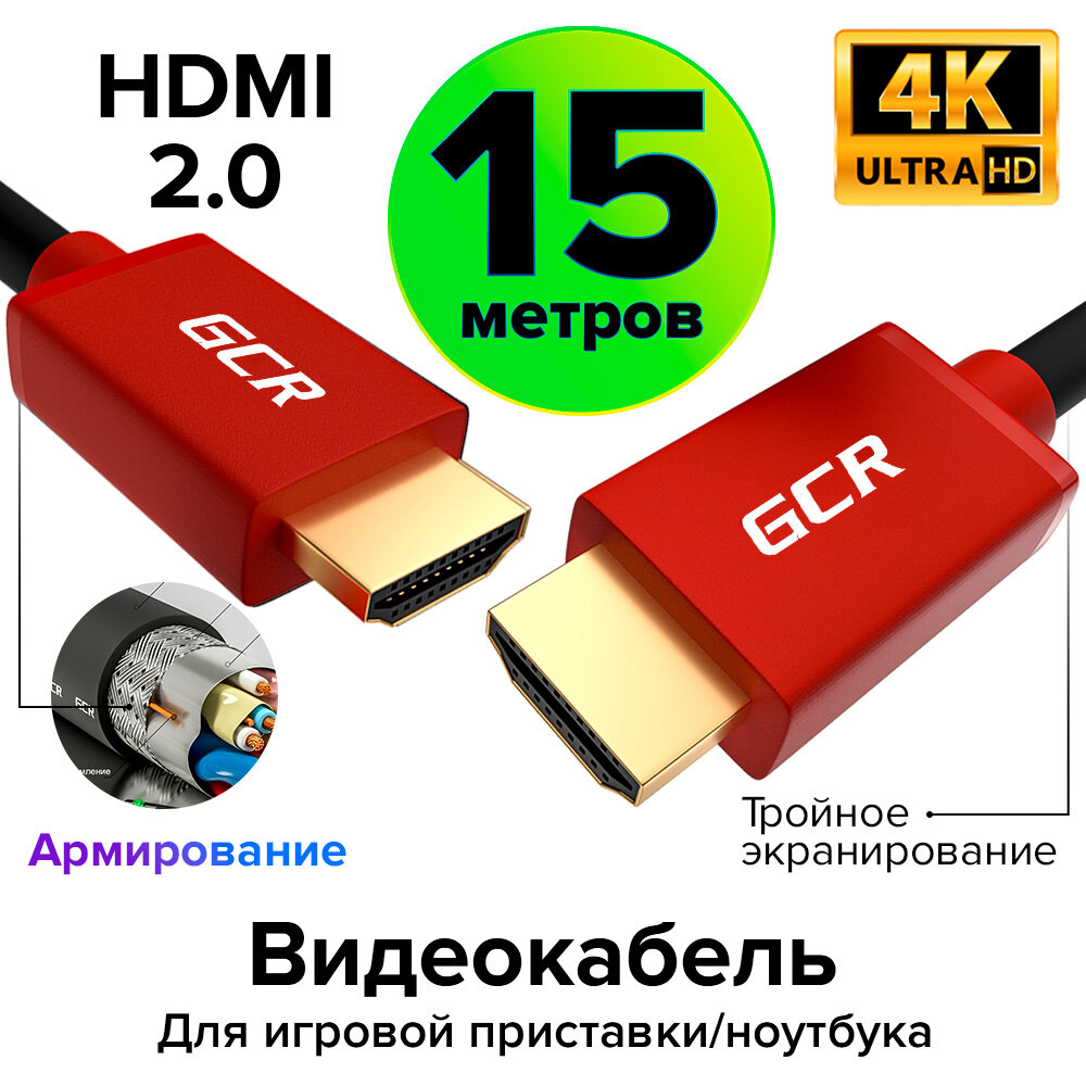 HDMI 2.0 кабель 15м 4K UltraHD HDR 3D 18 Гбит/с для PS4 PS5 Smart TV двойное экранирование армирование (GCR-HM401) черный;красный