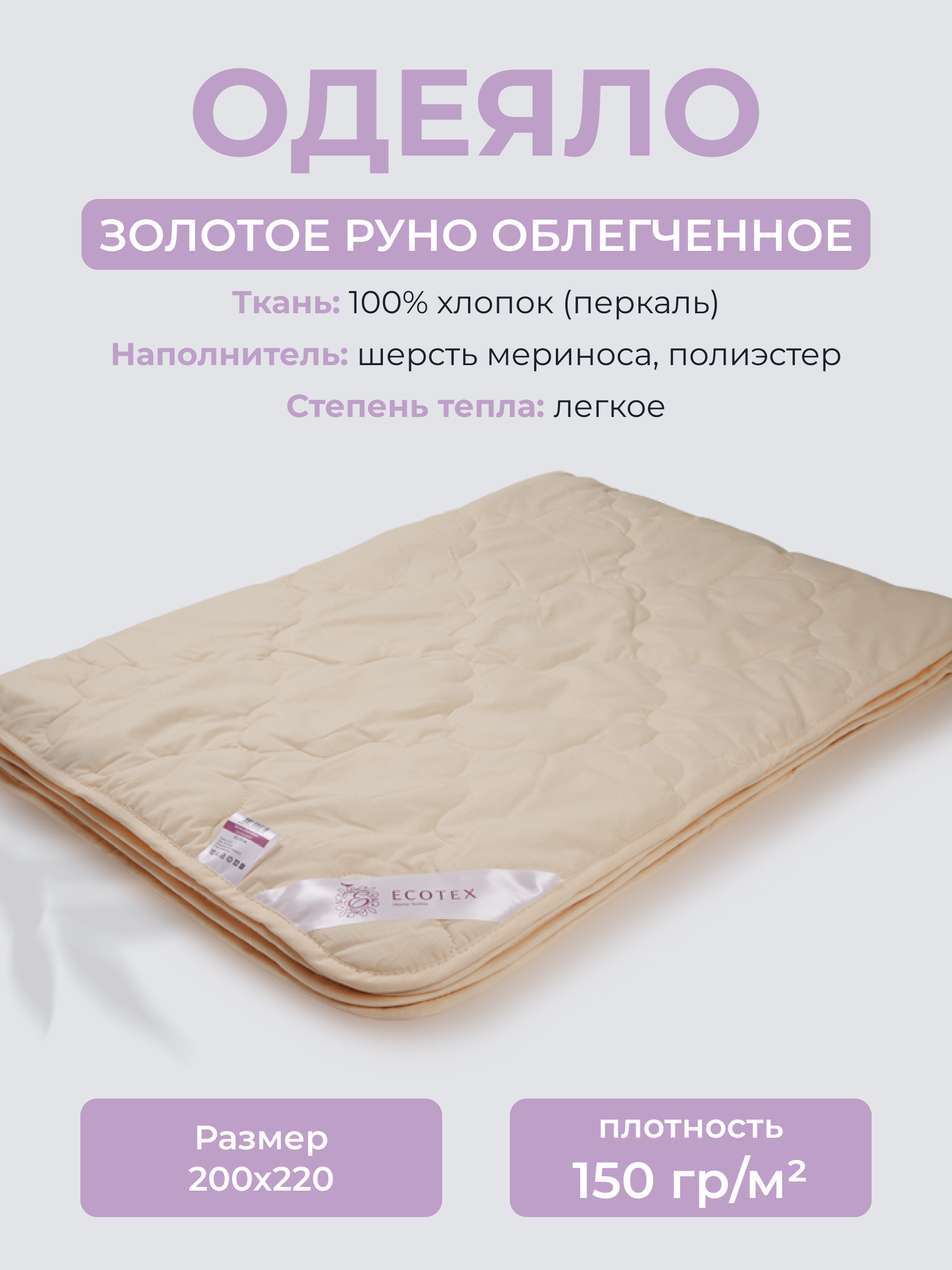 Одеяло Ecotex Золотое руно облегченное (200х220 см), шерсть мериноса, летнее