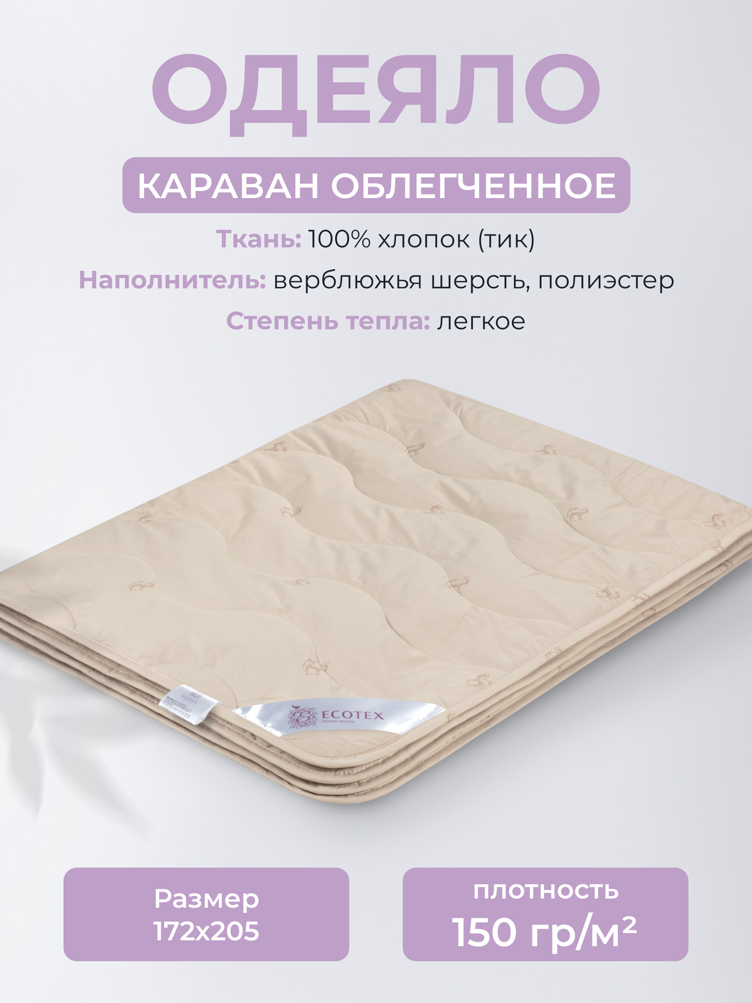 10 цен на Одеяло летнее облегченное верблюжья шерсть 2-спальное (172х205 см) "Караван", чехол - тик (100% хлопок), Ecotex