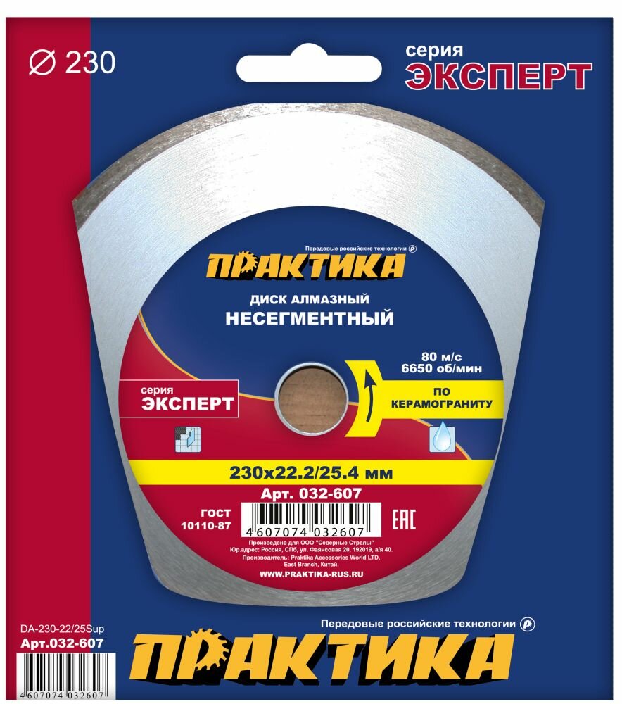 Диск алмазный несегментный ПРАКТИКА "Эксперт-керамогранит" 230 х 25,4/22 мм, (1 шт.) коробка информация: