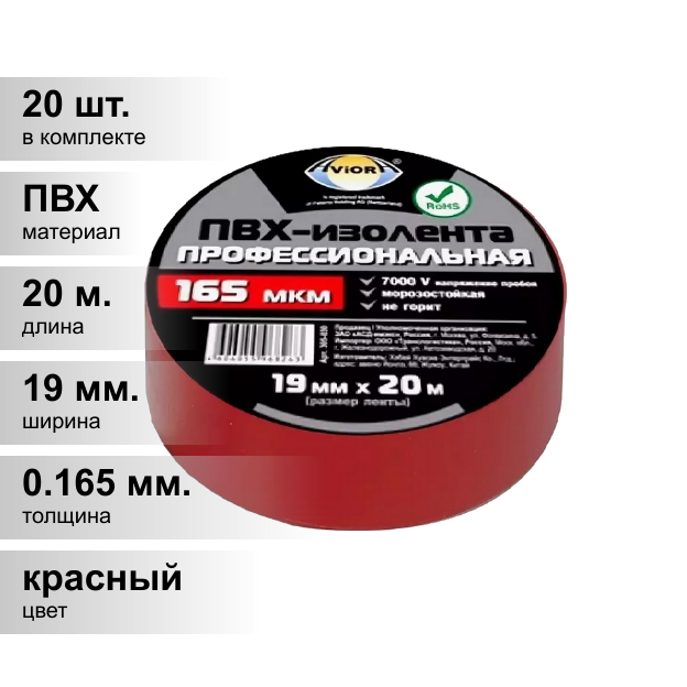 (20 шт.) Изолента ПВХ красная 19мм 20м 0,18мм профессиональная Aviora информация: