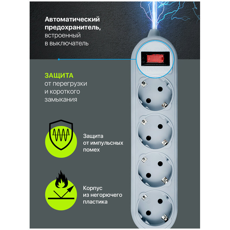 Удлинитель Defender G450 (99339), 4 розетки, с/з, 10А / 2200 Вт