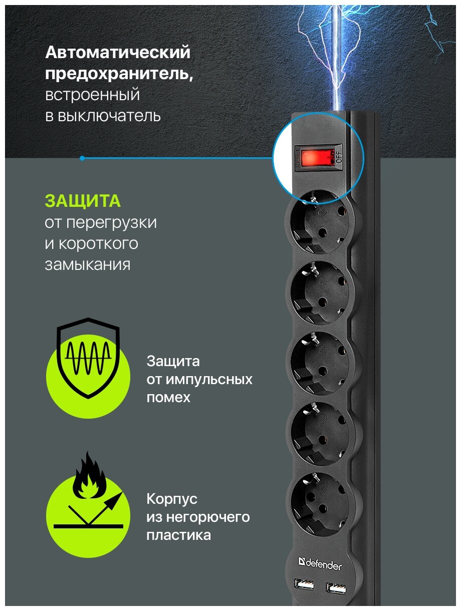 Сетевой фильтр - удлинитель Defender 5 розеток с заземлением , 5 метров , 2 USB ( 2.1 А ) , выключатель , чёрный информация: