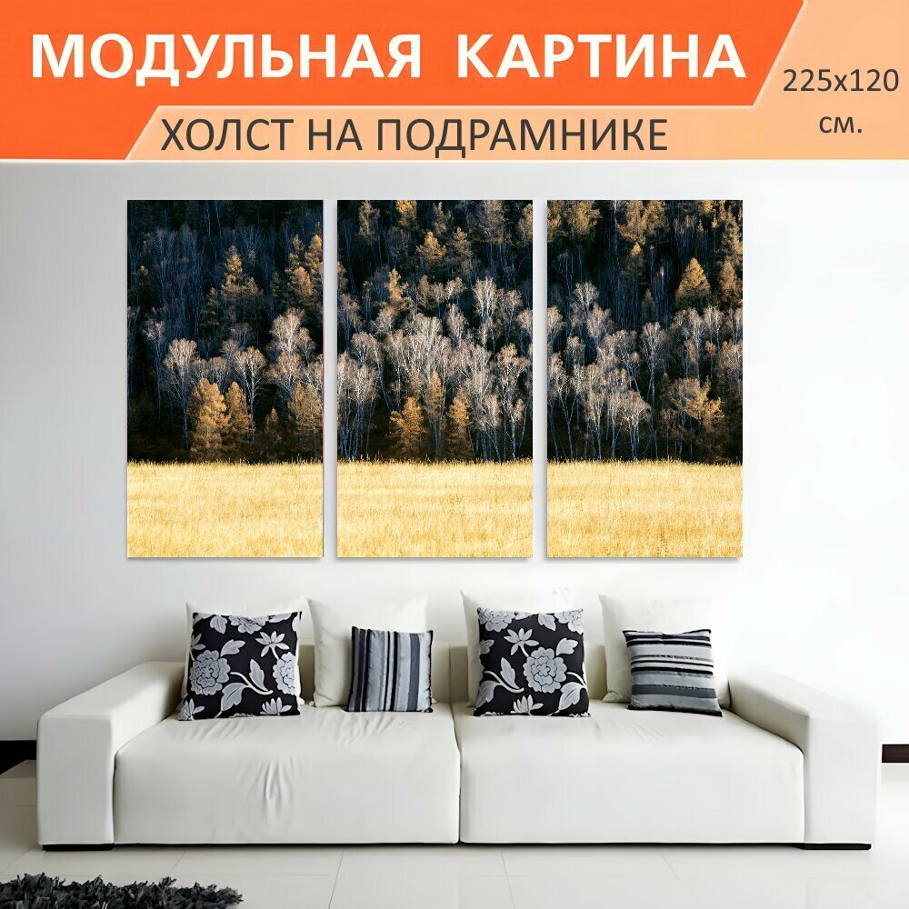10 цен на Модульная картина на холсте "Поздняя осень, лес, луг" триптих на подрамнике 225х120 см. для интерьера