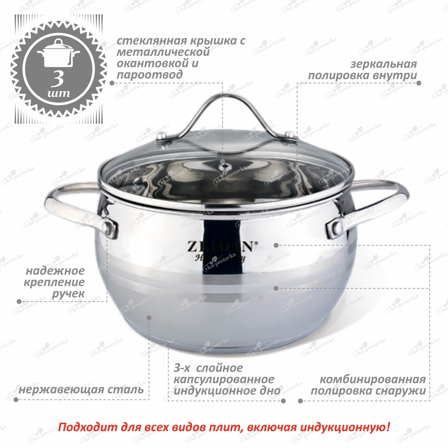 Набор посуды для приготовления из нержавеющей стали Zeidan кастрюли 2.1, 3 и 4 литра с крышками для газовых, электрических и индукционных плит 4 130 ₽