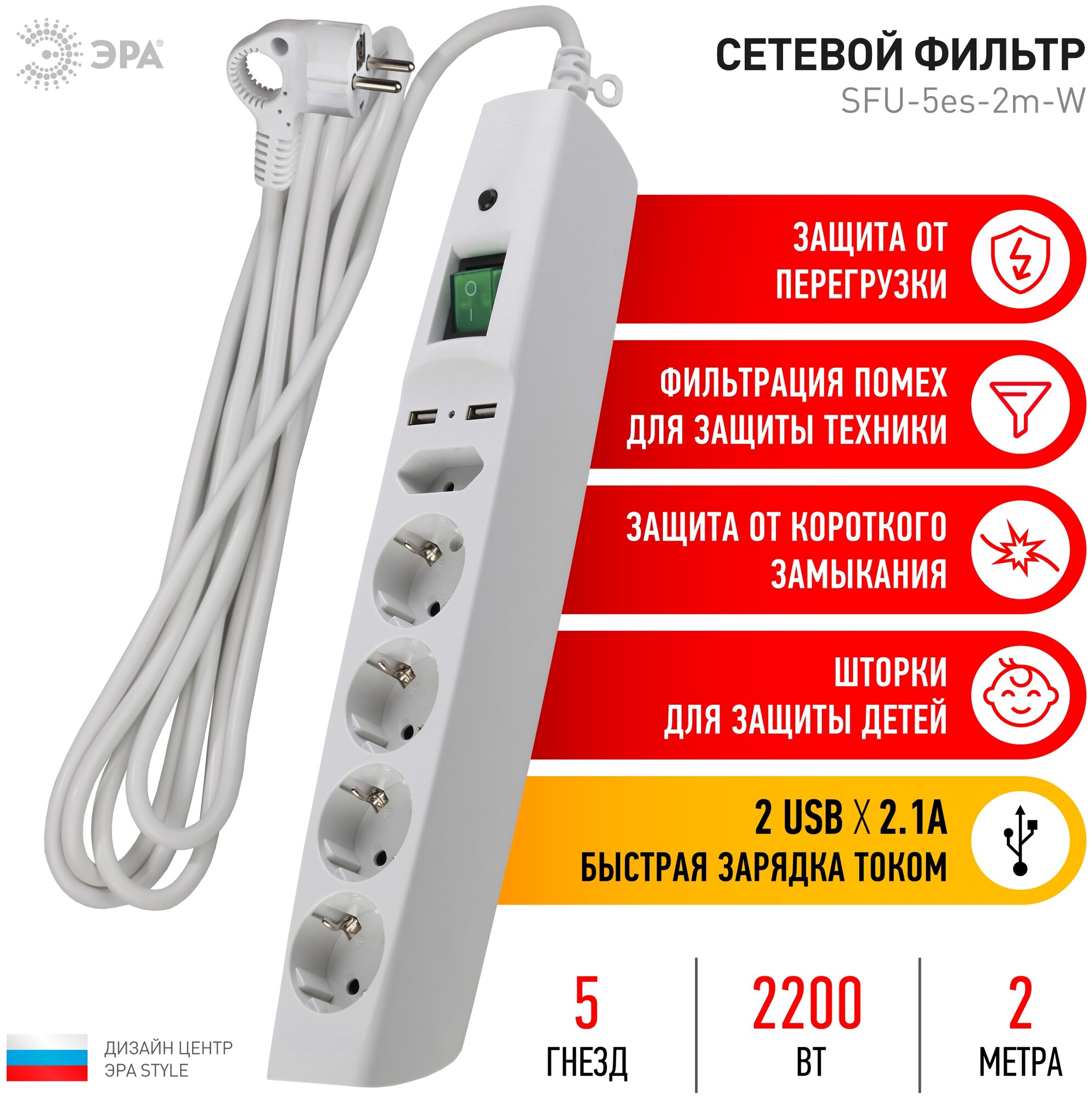 Эра C0043327 Сетевой фильтр SFU-5es-2m-W с надежной защитой с заземлением с выключателем 5 розеток 2xUSB 2м 10А белый