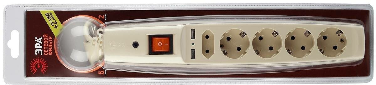 Фильтр сетевой 2м 10А 2200Вт 5 гнезд + 2 USB с заземлением бежевый ЭРА SFU-5es-2m-I