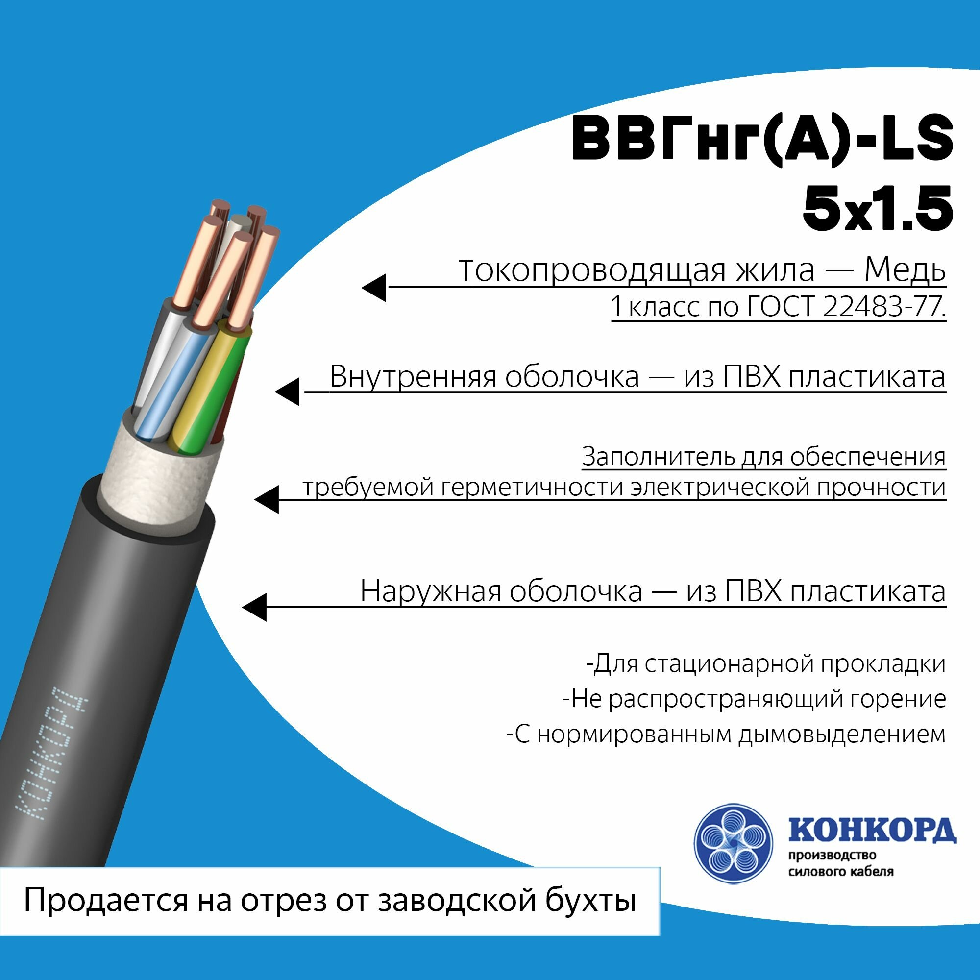 Силовой кабель ВВГнг(A)-LS 5х1.5 Конкорд 50метров ГОСТ информация: