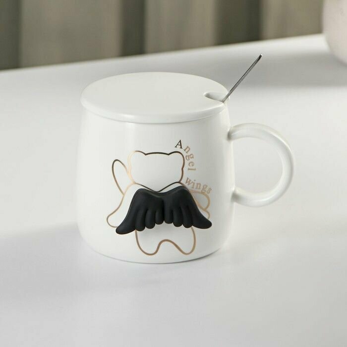 10 цен на Кружка керамическая с крышкой и ложкой Ангелок, 350 мл, цвет белый