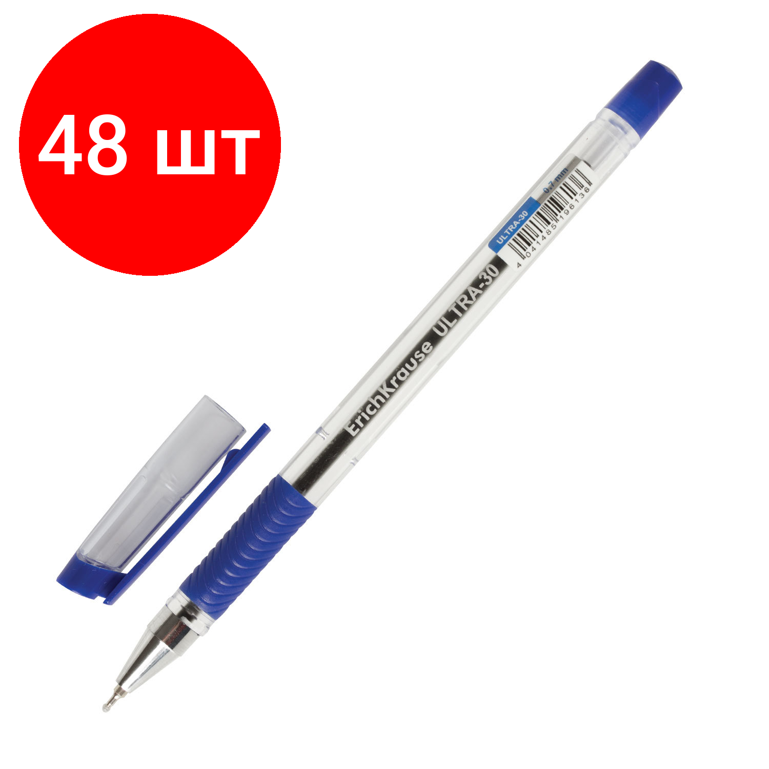 10 цен на Комплект 48 шт, Ручка шариковая масляная с грипом ERICH KRAUSE "Ultra-30", синяя, корпус прозрачный, узел 0.7 мм, линия письма 0.26 мм, 19613