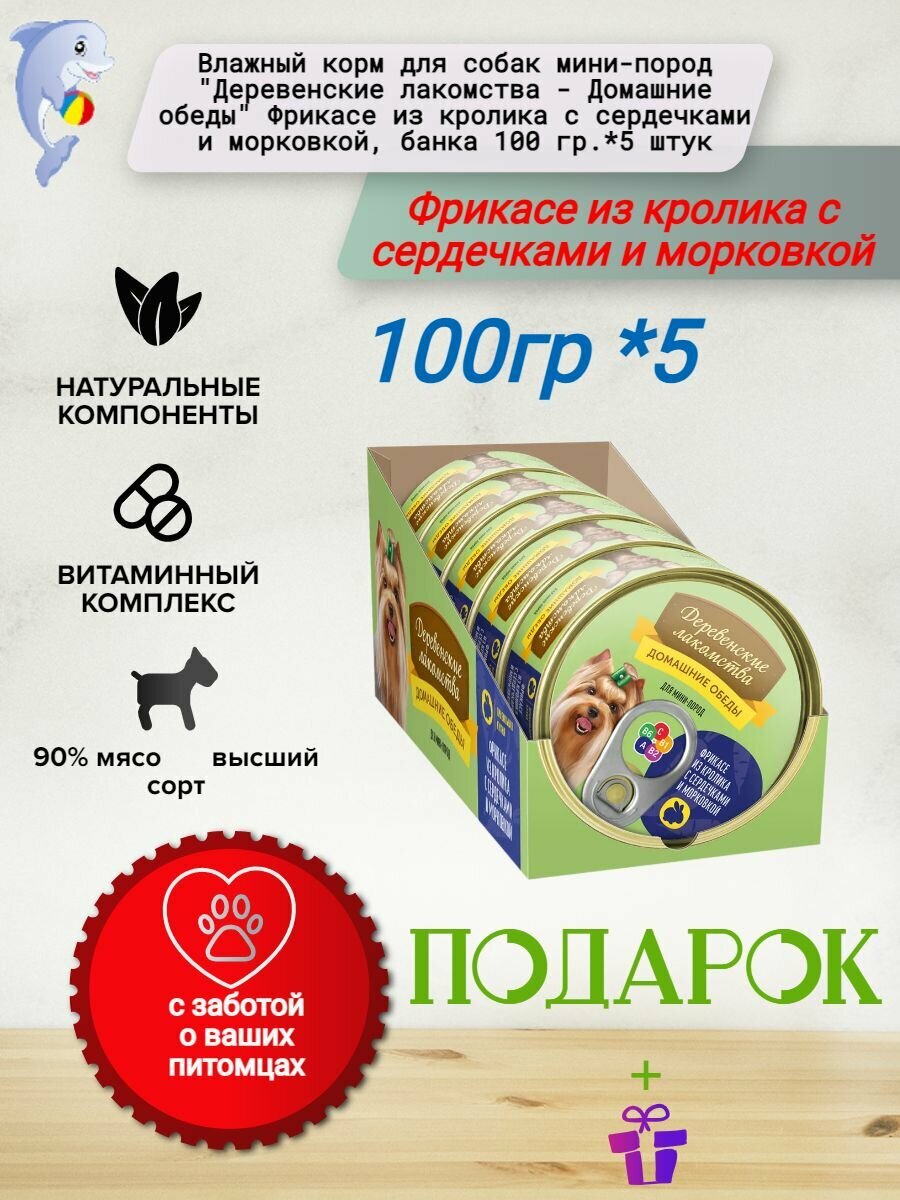 Влажный корм для собак мини-пород "Деревенские лакомства - Домашние обеды" Фрикасе из кролика с сердечками и морковкой, банка 100 гр.*5 штук информация: