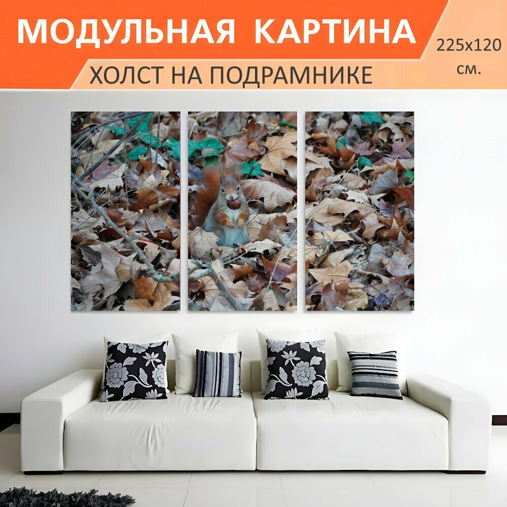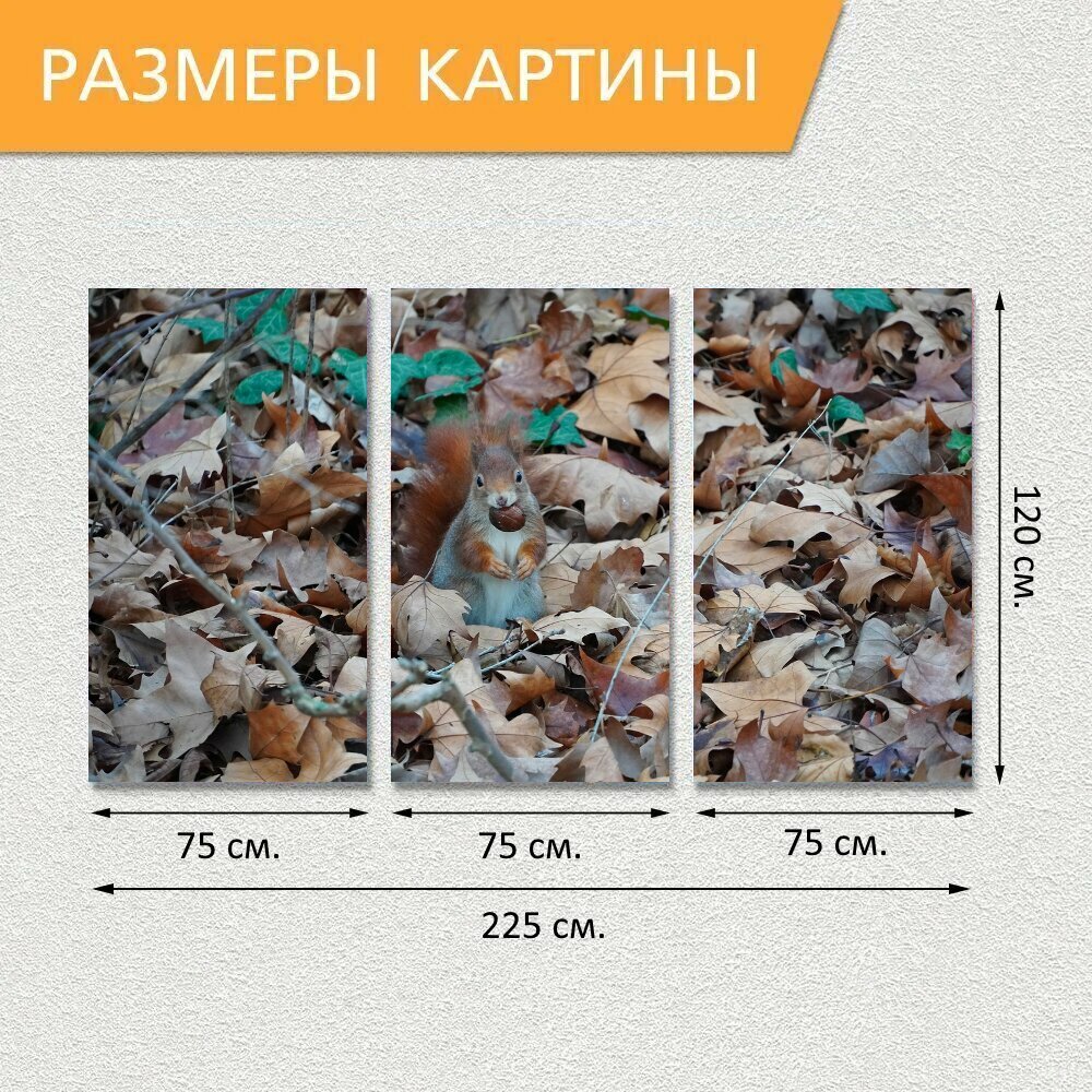 10 цен на Модульная картина на холсте "Белка, орех, парк" триптих на подрамнике 225х120 см. для интерьера