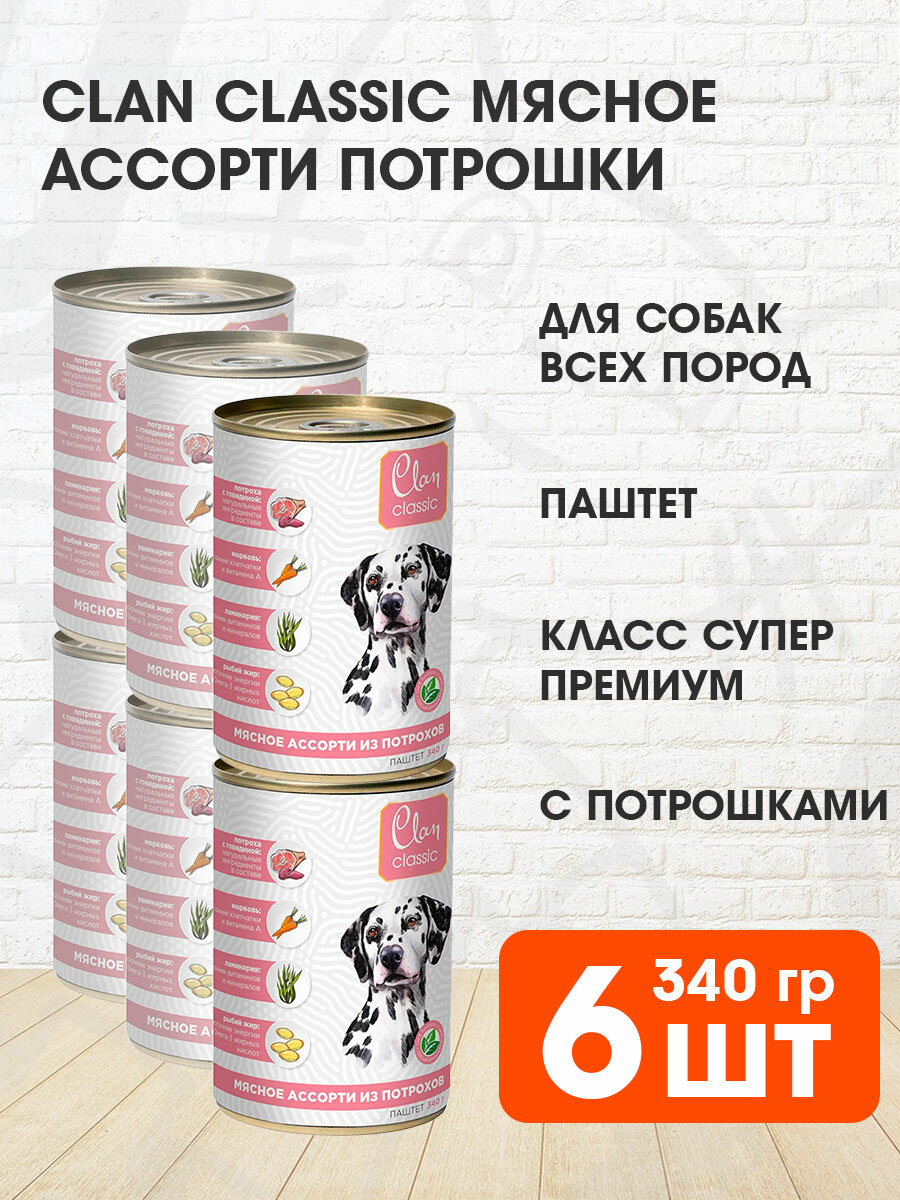 10 цен на CLAN CLASSIC мясное ассорти для взрослых собак с потрошками банка NEW 340 гр х 6 шт