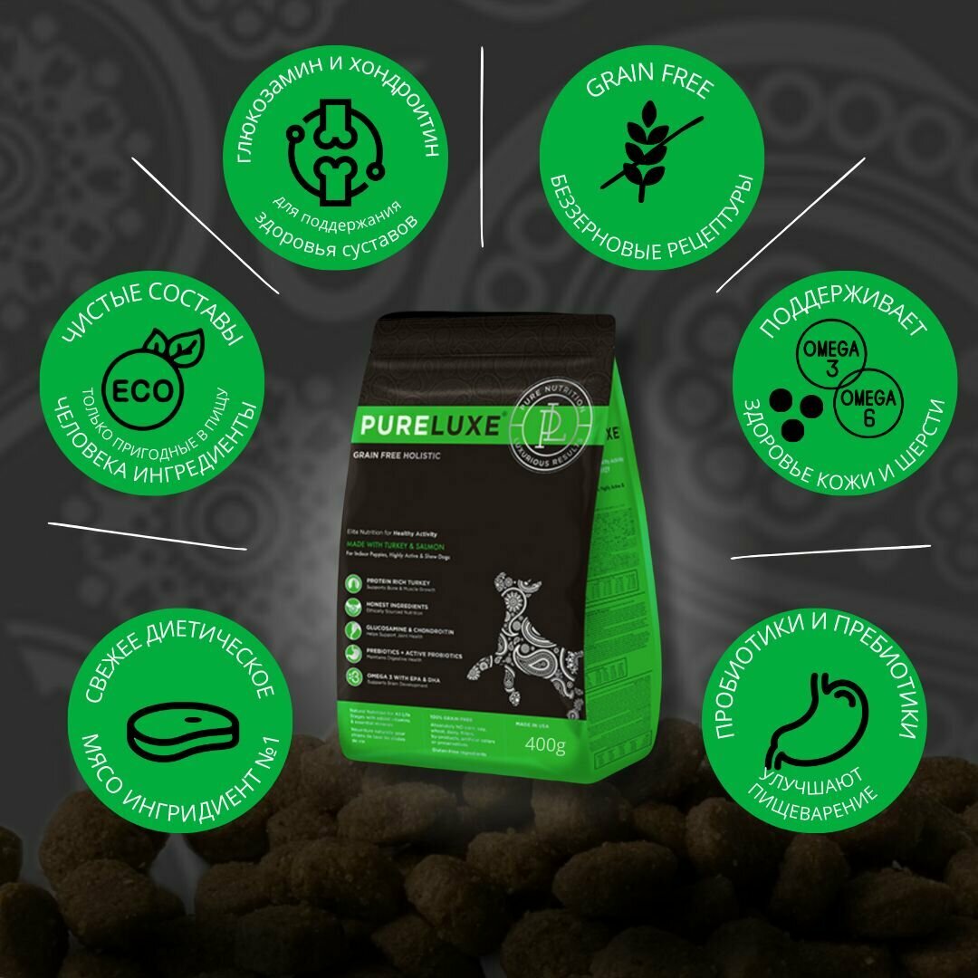 Сухой корм для собак PureLuxe беззерновой, для щенков и активных собак, индейка, лосось 1 уп. х 1 шт. х 400 г