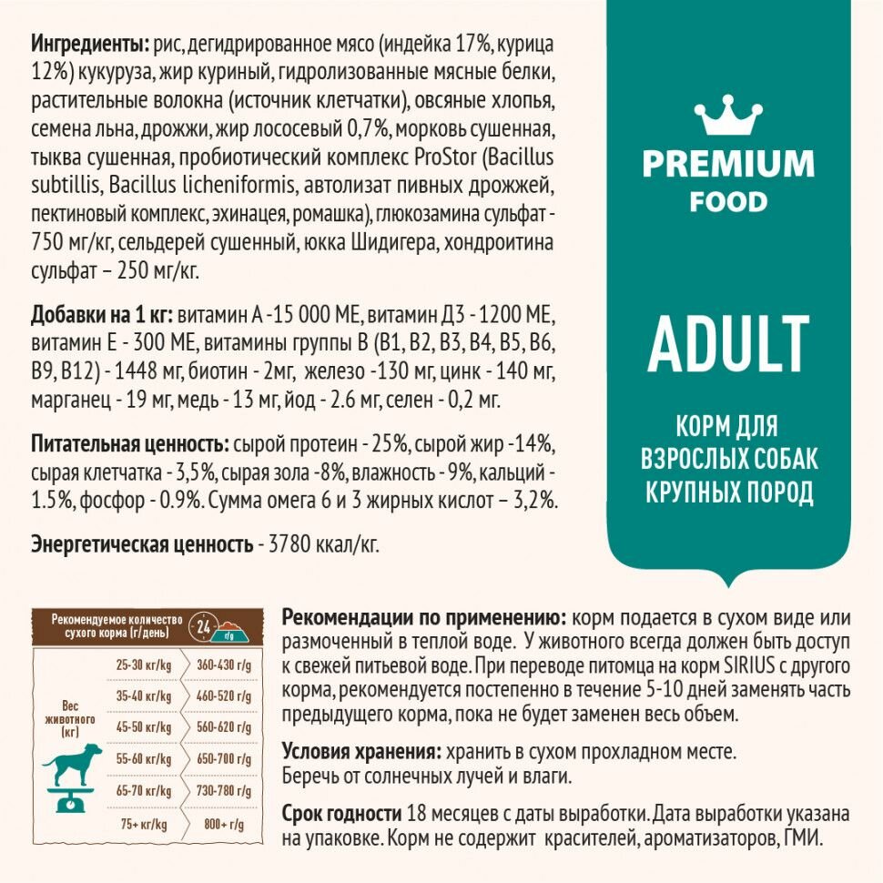 Sirius Сириус сухой полнорационный корм для взрослых собак крупных пород Индейка с овощами 15 кг