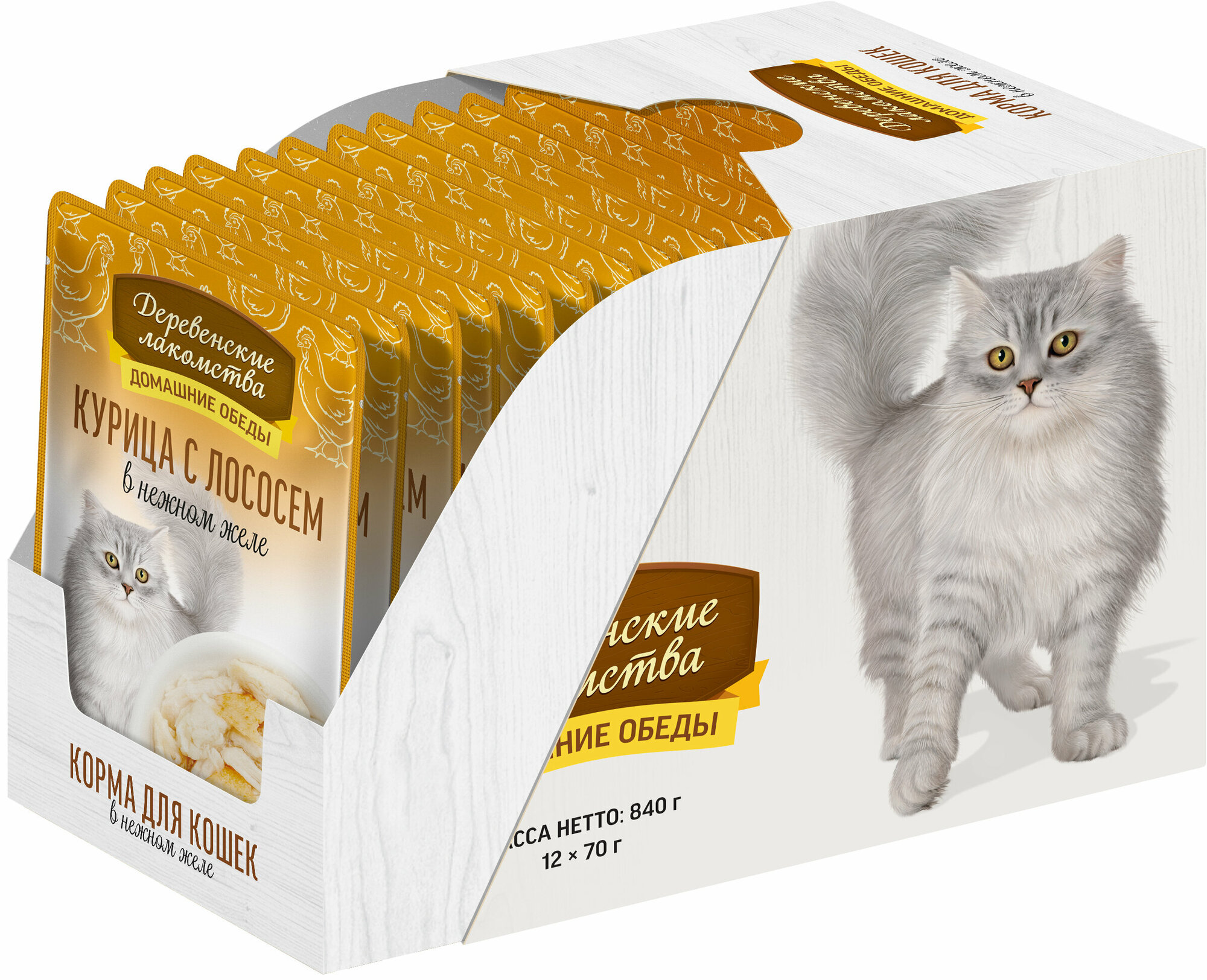 Влажный корм для кошек "Деревенские лакомства" курица с лососем в нежном желе 70 гр.*12 шт. информация: