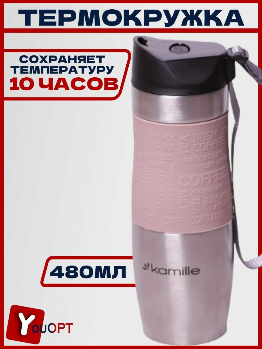 Отзывы на Термокружка 480мл из нержавеющей стали с TPR-вставкой и ремешком (серая, фиолет., голубая, беж.) Kamille 2051