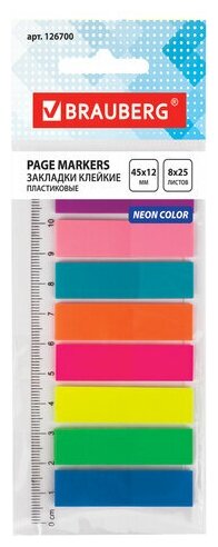 Закладки/стикеры клейкие самоклеящиеся для книг и ежедневника Brauberg Неоновые пластиковые, 45х12 мм, 8 цветов х 25 листов, на линейке 12 см