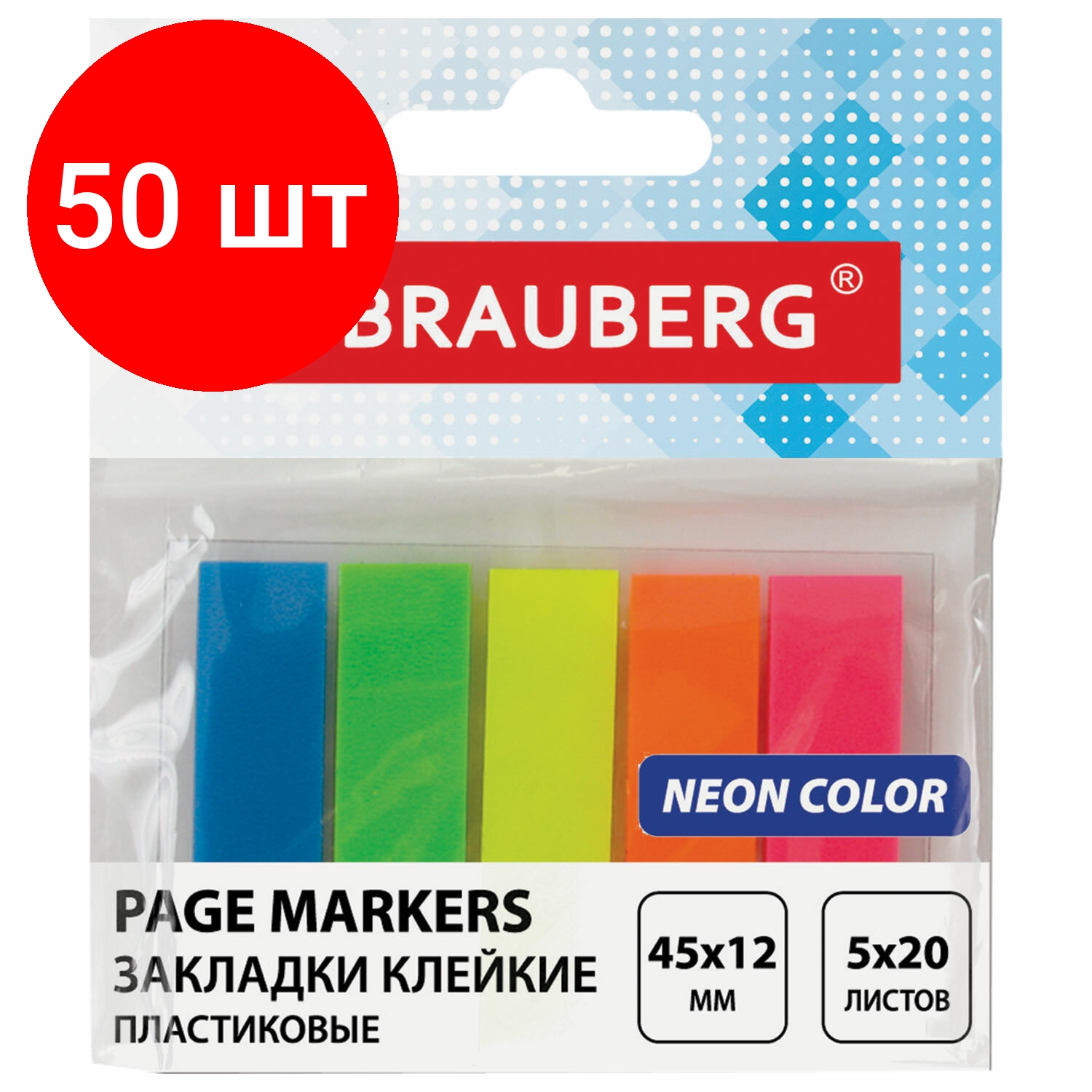 Комплект 50 шт, Закладки клейкие BRAUBERG неоновые, пластиковые, 45х12 мм, 5 цветов х 20 листов, на пластиковом основании, 122706 информация: