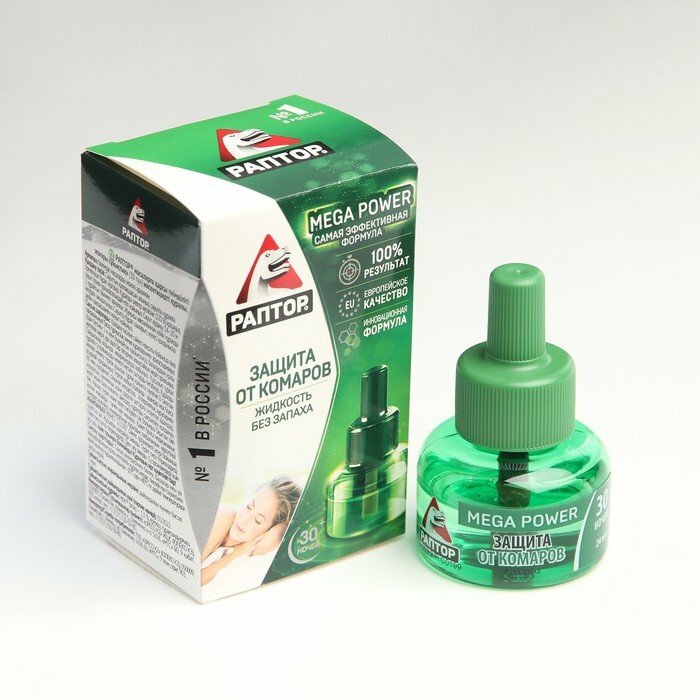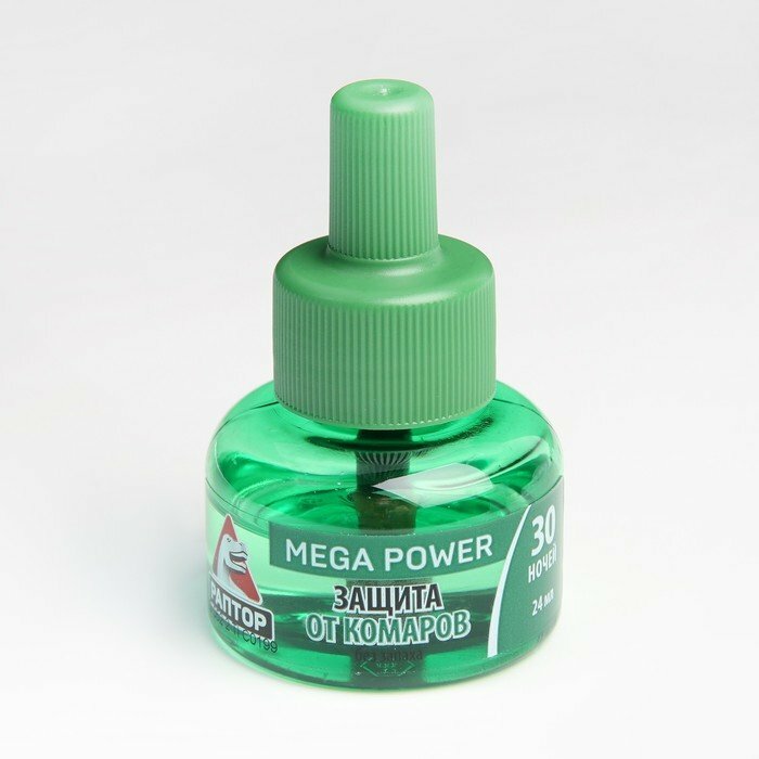 Жидкость для фумигатора Раптор от комаров повышенной эффективности Mega Power, 60 г, 24 мл, 30 ночей, зеленый