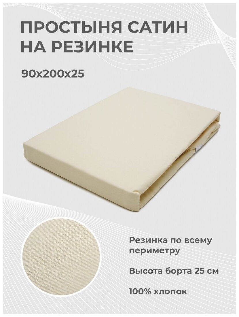 Простыня на резинке Альвитек, 090х200x25, ткань 100% хлопок Сатин, цвет Кремовый, арт. ПР-СО-Р-090-КРЕМ информация: